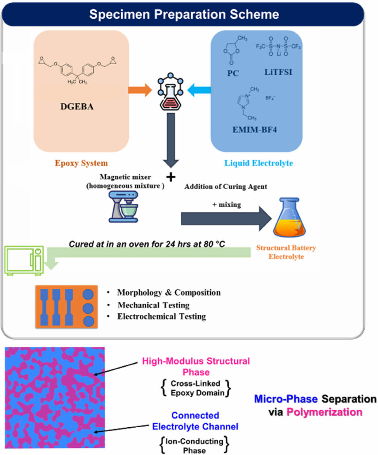 To prepare the polymer samples, 1 M LiTFSI was completely dissolved in 99 wt% of EMIMBF4 and 1% PC to formulate the liquid electrolyte phase, and then it was mixed with the epoxy phase using a magnetic stirring setup at room temperature until a homogeneous mixture was formed. The formulated polymer was mixed according to the mass ratio of the liquid electrolyte to epoxy, refereed as SBE_ (Electrolyte/Epoxy; i.e., SBE_0.75, SBE_1, SBE 1.25). Then it was cast in a steel mold to make specimens for further characterization. A schematic of the fabrication process with the resulting bi-phasic structures is shown in Fig. 1.