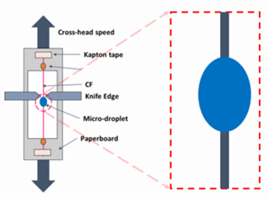 A microdroplet of the polymer [60~100 um] was placed on the carbon fiber surface by a needle tip and cured. The droplet was sheared in a mode II loading by a micrometer knife edge with a cross-head speed of 0.1 mm/min.