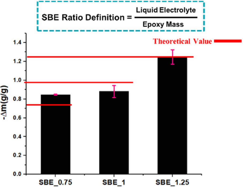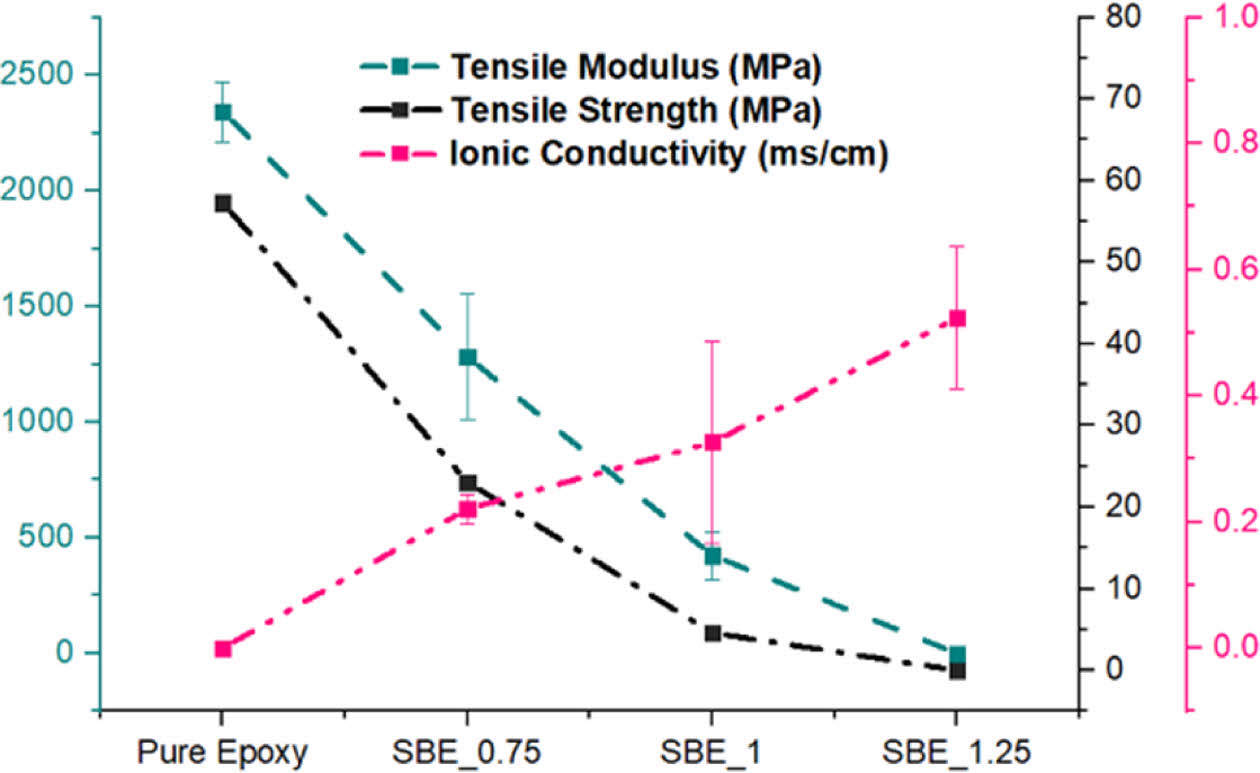 As it can be noticed, upon the introduction of electrolyte: the mechanical performance is significantly deteriorated. However, Poisson’s ratio is relatively constant, implying that although electrolyte is introduced, the axial and transverse strains are still proportionally related to the structural epoxy phase. Nevertheless, the degradation of the mechanical performance in the SBE is accompanied with a significant increase in electrochemical performance. As the increase of the electrolyte percentage, it promotes the continuous formation of the electrolyte channels within the epoxy phase. The trade-off relation can be seen in Fig. 7.