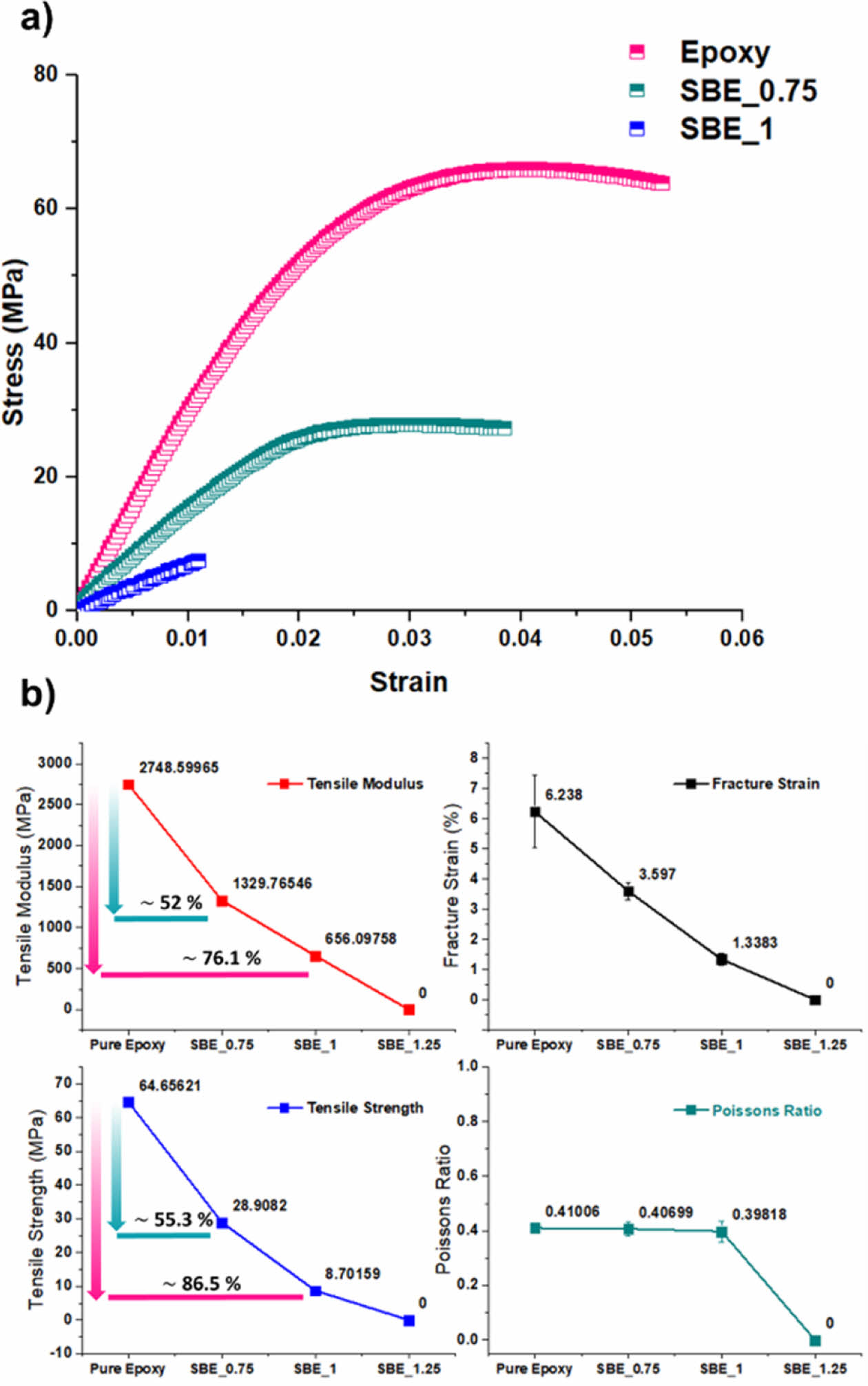 Fig. 6 a) Stress-strain curves of different SBEs b) Polymer tensile test results |