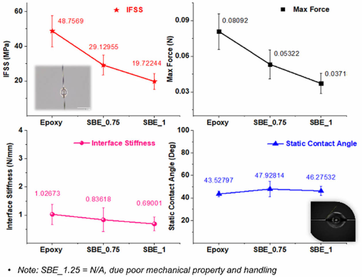 As it is expected due the lower mechanical performance (i.e. elastic modulus of the SBE) and the introduction of the electrolyte phase at the interface which does not take any load; there is a noticeable decrease in the IFSS as the electrolyte increases. Furthermore, the measurement of contact angle by single-fibers' droplets does not reveal any significant distinctions. Consequently, it can be deduced that the wettability of carbon fiber by the SBE was not notably altered in comparison to the epoxy scenario.