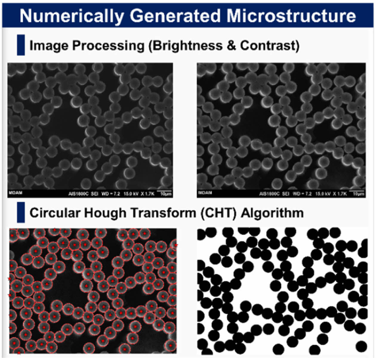 Prior to the computational analysis, the fiber volume fraction (FVF) must be identified to effectively study composite structural batteries as FVF is strongly related to both the mechanical and electrochemical performance. The FVF was analyzed according to ASTM D3171 (i.e., matrix burn) and cross-sectional image processing. The image processing was conducted using MATLAB in-house code to estimate the fibers centers and diameters via circular Hough transform (CHT) algorithm. Then the stored circles (i.e., centers and radii) were convoluted using an impulse function as shown in equation (3)