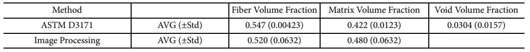 The results for the FVF for the two methods, are shown in table (1), with around 5% difference. Also, image processing was proved to be a powerful technique to estimate the fiber diameter, and it was found to be 7.43 ± 0.4 um a very close approximation to the manufacturer’s reported diameter 7 um. An example of a processed binary image is shown in Fig. 9.