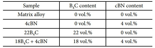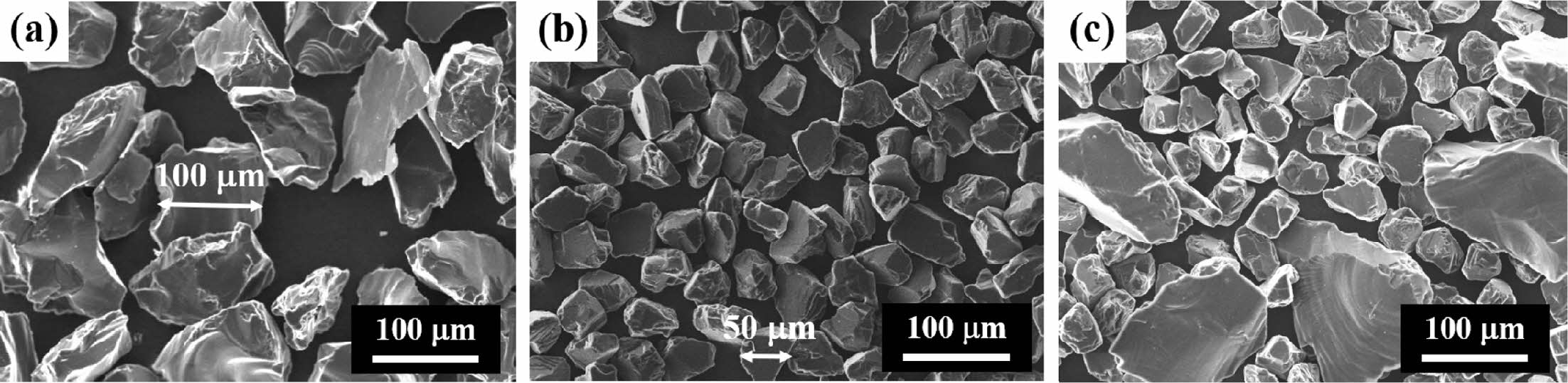 금속복합재료의 기지재로는 Al1100(99.99%, Komajawa metal, Japan)를 사용하였고 강화재로는 B4C(Dunhua Zhengxing Abrasive Co., Ltd., Dunhua, China) 분말과 cBN 분말(ILJIN Diamond, Korea)을 사용하였다. cBN 입자가 중성자 흡수 복합재의 특성에 미치는 영향을 조사하기 위해서 Table 1와 같이 다양한 강화재를 지닌 복합재를 설계하였다. 사용 분말들의 SEM image를 Fig. 1에 나타내었으며 Fig. 1(a), (b)에 나타나 있듯이 B4C의 경우 100 mm의 평균 입자크기를 가지고 cBN의 경우 50 mm의 평균 입자크기를 나타내는 것을 확인할 수 있었다. Fig. 1(c)는 B4C, cBN을 혼합한 경우이다.