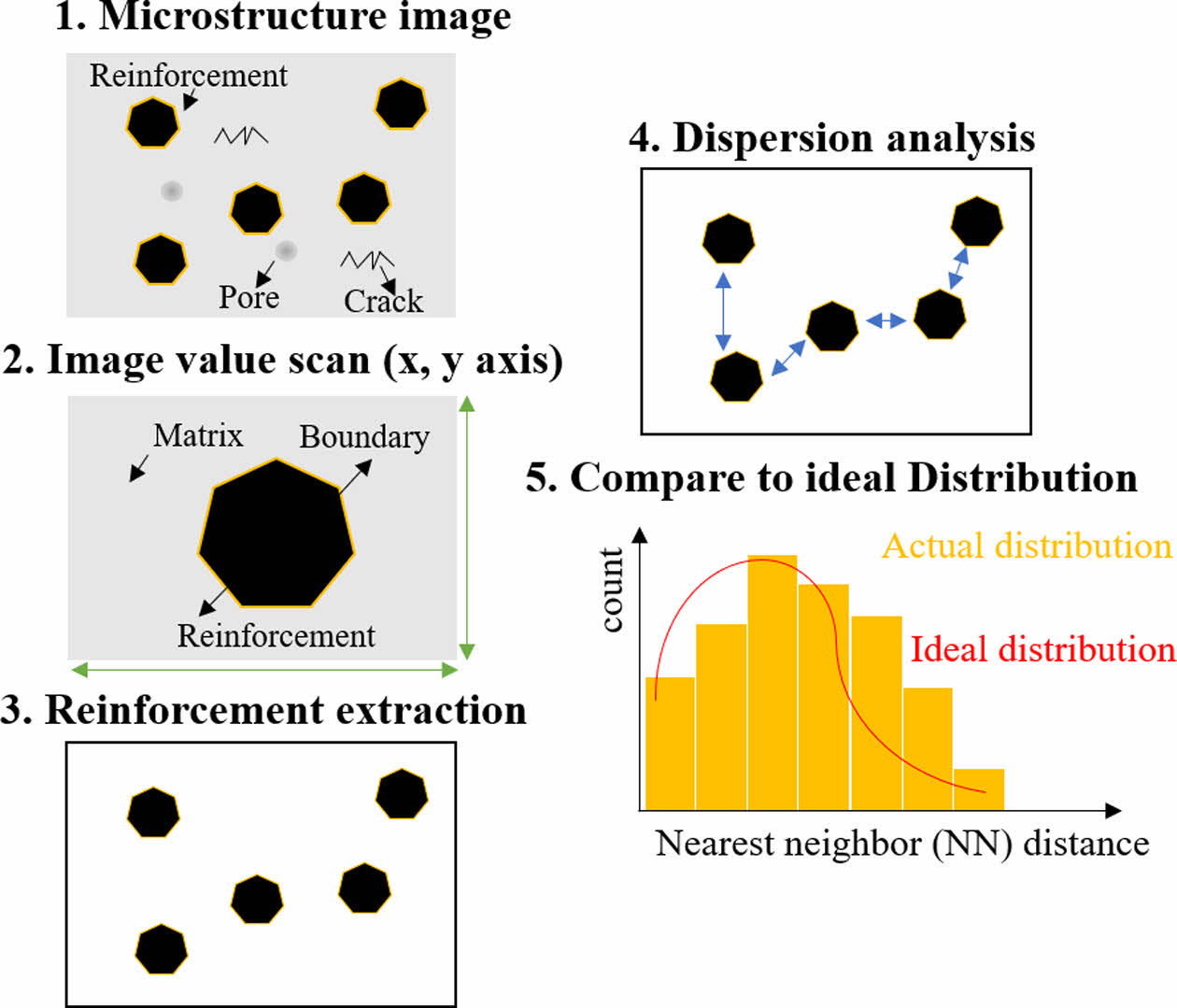 B4C 및 cBN을 강화재로 하여 교반주조와 압연 공정을 통해 제조된 알루미늄 복합소재의 강화재 체적률 및 분산정도를 평가하기 위해 주사전자현미경(JSM-6610LV, JEOL, Japan)으로 미세조직을 관찰하였고 강화재 체적률 및 강화재 분산도 계산 프로그램[13]을 통해 복합소재 표면부 미세조직 특성을 분석하였다. 이때 분산도란 강화재 입자가 기지재 내에 얼마나 균일하게 분포되어 있는지를 정량적으로 계산한 값이다. 해당 분석 방법에 대한 이해를 돕기 위하여 Fig. 3에 분석 방법에 대한 개요도를 나타내었다. 미세조직 이미지에서 강화재 입자, 금속 기지재, 계면의 Image value를 통해 미세구조에서 강화재 입자를 추출해낸다. 이후 추출된 입자들 사이 간 거리와 이상적 분포와의 정량적인 비교를 통해 강화재의 분산도를 계산하며 이러한 방법을 통해 복합소재의 분산도를 측정하였다. 추가로 기지재-강화재 간 반응 관계를 파악하기 위해 전계방사형 전자현미분석기(JXA-8530F, JEOL, Japan)을 이용하여 원소 매핑을 통해 분석을 진행하였다.