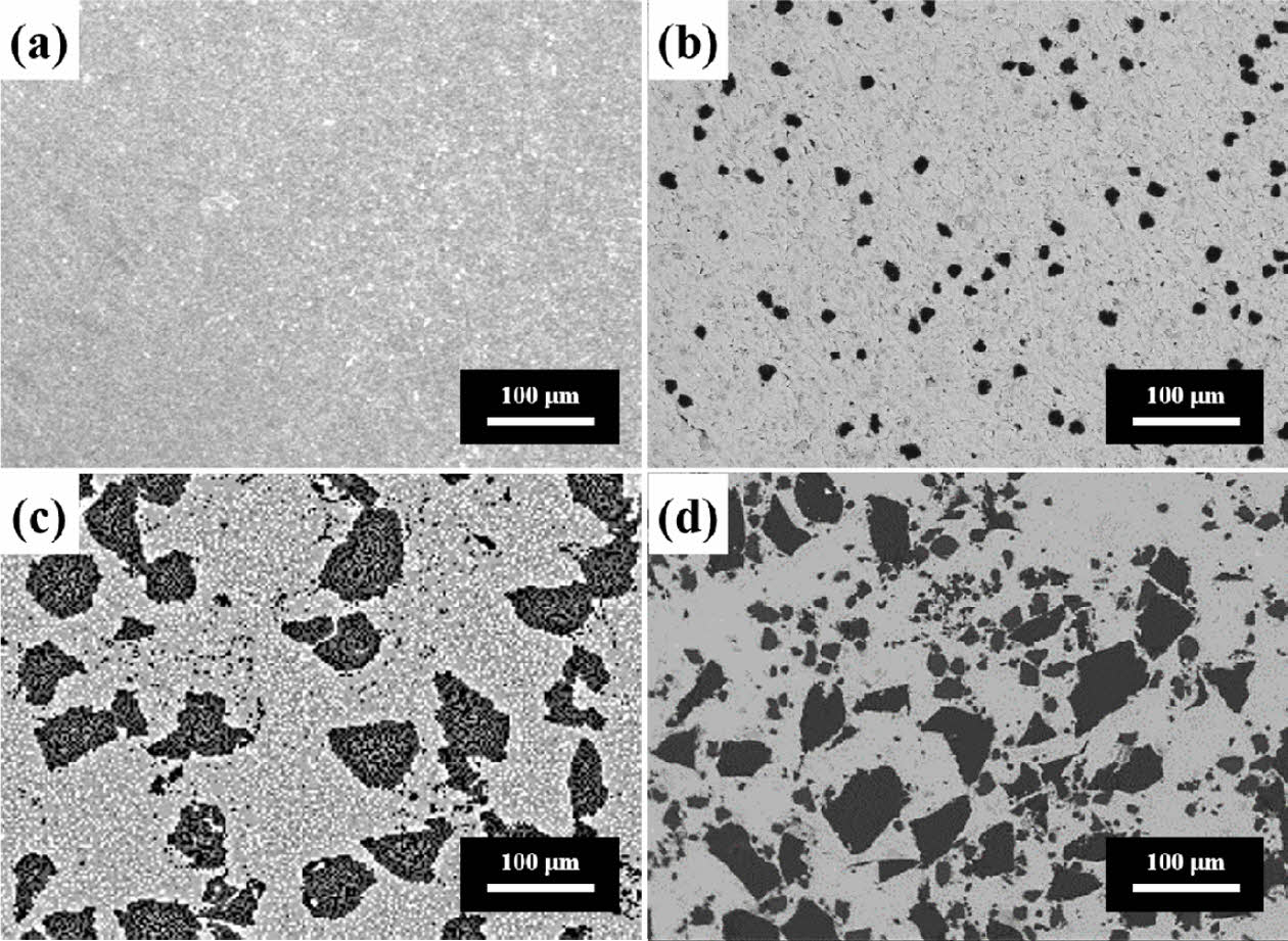 제조된 기지재 및 복합재의 밀도(상대밀도(%))는 각각 Matrix alloy, 4cBN, 22B4C, 18B4C + 4cBN의 순서로 2.674 ± 0.005 g/cm3 (99.0 ± 0.002), 2.703 ± 0.01 g/cm3 (99.3 ± 0.003), 2.603 ± 0.004 g/cm3 (97.8 ± 0.001) 그리고 2.674 ± 0.007 g/cm3 (99.2 ± 0.003)로서 상대밀도로 보아 낮은 기공도를 가지며 건전하게 제조된 것으로 확인하였다. 추가적으로 복합소재의 미세구조를 분석하기 위해서 압연까지 수행된 복합재의 단면을 연마하여 SEM을 이용하여 미세조직을 관찰하였고 이는 Fig. 4에 나타내었다. Fig. 4(a)는 기지금속의 미세조직을 나타내며, 내부 결함이 없는 것으로 관찰되었다. Fig. 4(b)-(d)를 통해 제조된 금속복합소재의 미세조직 관찰 결과를 통해 강화재의 분산이 균일하고 결함 및 기공이 없는 조직을 가지는 것을 확인하였다. 복합소재별 강화재의 분산도 및 함량을 측정하였고 Table 2에 정리하였다.