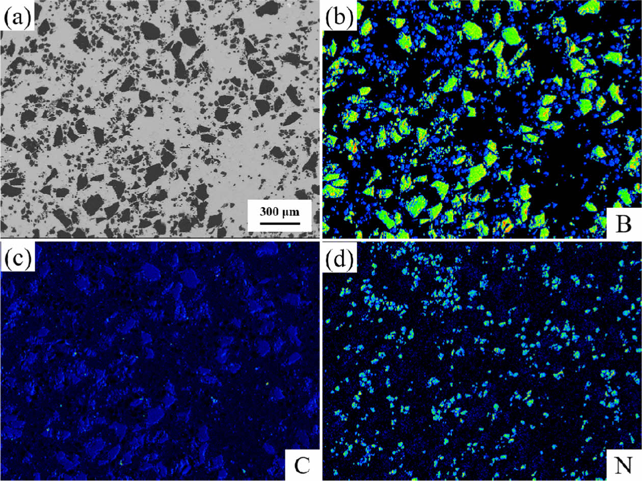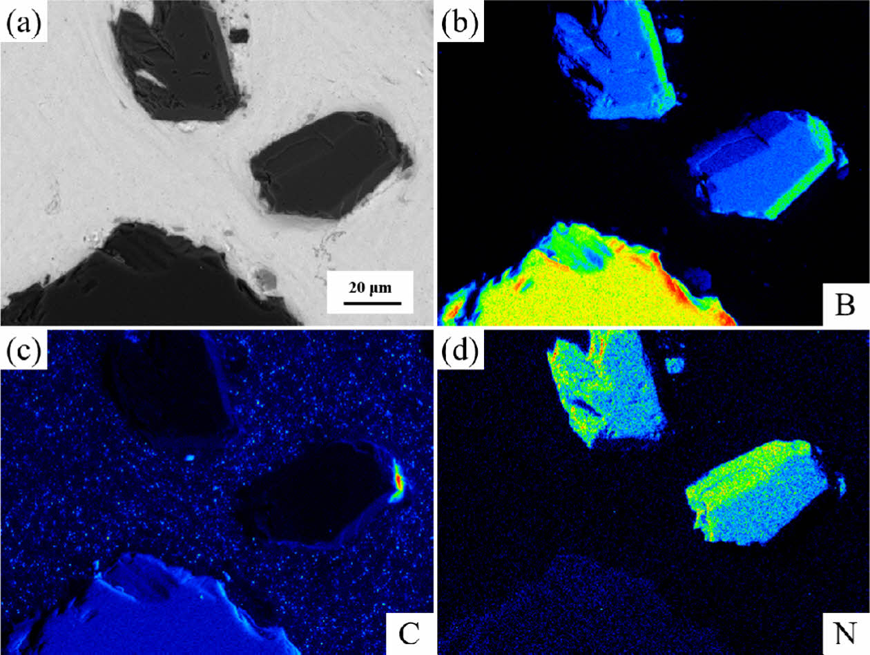 18B4C + 4cBN 복합재의 제조 중, 주조와 압연 과정에 있어서 강화재는 높은 온도에 노출되므로 기지금속과의 화학 반응이 발생하며 이는 복합재 물성에 상당한 영향을 미친다[18,19]. 따라서 해당 복합소재 내에서의 화학반응을 추적하기 위해서 EPMA 분석을 진행하였고 원소 별 매핑을 통하여 계면 반응상을 확인하였다. Fig. 5는 저배율로 수행한 EPMA 이미지이다. Fig. 5(a)는 SEM 이미지이며 큰 입자는 B4C 작은 입자는 cBN로 추정된다. Fig. 5(b)는 Boron의 함량에 따른 EPMA mapping이며 이를 통해서 B4C와 cBN을 구분할 수 있으며 더 나아가서 C level (Fig. 5(c))와 N level (Fig. 5(d))을 통해서 더 명확히 구분이 가능하다. 저배율 EPMA에서 cBN과 B4C 모두 B, C, N의 확산이 이루어지지 않은 것으로 보이나, 정밀한 분석을 위해서 고배율의 EPMA 분석을 진행하였다(Fig. 6). Fig. 6(b)-(d)의 고배율 EPMA 이미지에서도 마이크로 크기의 계면 화합물이 발견되지 않았다.