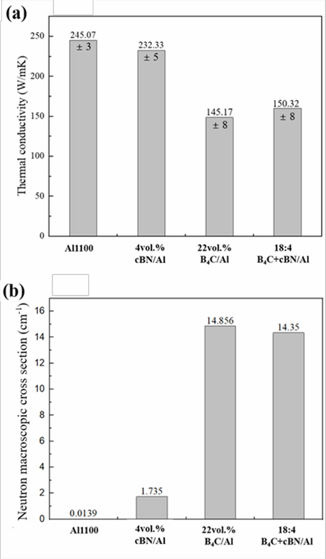 cBN과 B4C가 강화재로 투입된 복합재의 응용처는 중성자 흡수용 소재이기 때문에 열전도도와 중성자 흡수능의 분석이 필수적이다. 제조된 복합재의 열전도도와 중성자 흡수능이 Fig. 7에 나타나 있다. Fig. 7(a)에 나타나 있듯이 4 vol.%의 cBN 투입을 통해 Al1100 기지재 대비 13 ± 5 W/mK의 열전도도가 감소하였으며 22 vol.% B4C 투입 4 vol.%와 18 vol.%를 동시에 넣은 복합재는 95 ± 8 W/mK 정도의 열전도도 감소를 보이며 22 vol.% B4C 대비 낮은 열전도도 감소를 보였다.