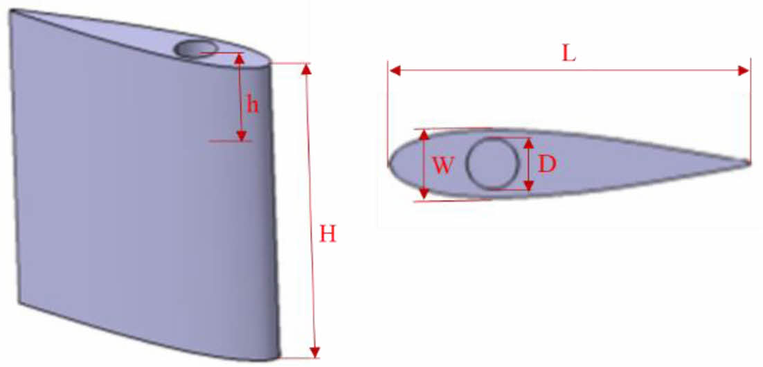 본 연구는 기존의 선박 방향타에 위상최적화를 적용함과 동시에 복잡한 내부 형상을 손쉽게 제작하기 위해 FDM(Fused deposition modeling) 방식을 적용하였다[8]. 3D 프린터로 제작 가능한 크기를 고려하여 실제 선박 방향타의 1/5 크기를 가지도록 하여 Fig. 1과 같이 선수 방향 길이 140 mm(L), 최대 폭 26.8 mm(W), 높이 150 mm(H)를 가지는 방향타를 설계하였다. 방향타 상부에는 방향타의 회전축을 고려하여 지름 20 mm(D), 깊이 50 mm(h)의 원형 구멍이 있다. 선박 방향타의 단면적은 Fig. 2와 같다. 적용된 소재는 3D 프린트 복합재료인 탄소섬유(Carbon fiber)와 오닉스(Onyx)를 사용하였다. 적층 정보는 3D 프린터 제조업체 Markforged의 슬라이싱 프로그램인 Eiger를 통해 확인할 수 있으며 파란 선은 탄소섬유를 나타내고 흰 선은 오닉스를 나타낸다. 3D 프린트 방향타 내부에 적용된 각 내부 위상 형상들은 육각형, 삼각형, 사각형 3가지 형상으로 한 변의 길이가 4 mm로 동일하게 설계되었다. 사각형상의 경우 ±45°로 적층된다.
