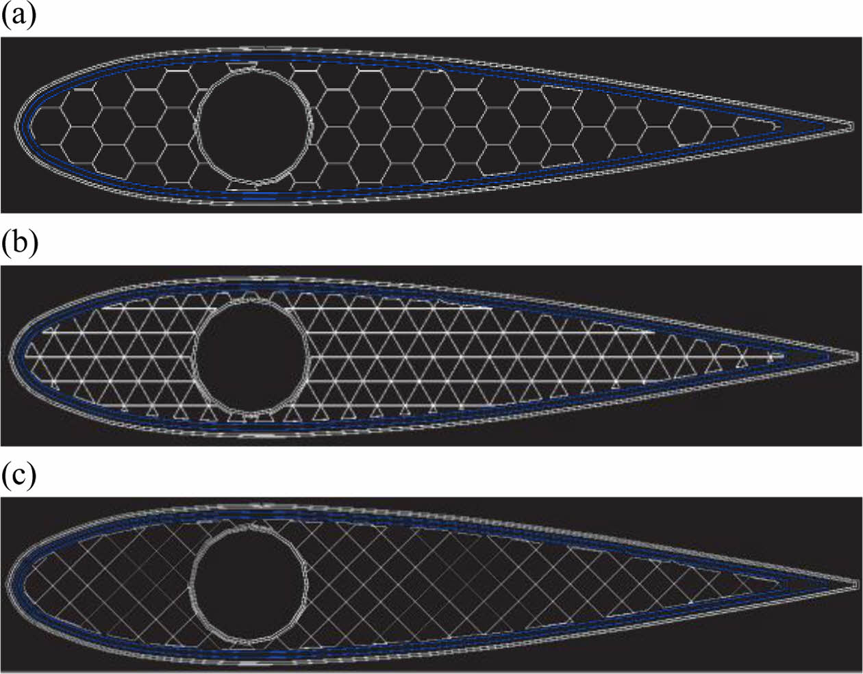 Fig. 2 The cross section of 3D printed rudder surface: (a) Hexagonal (b) Triangular (c) Rectangular |