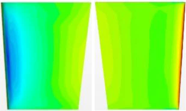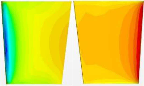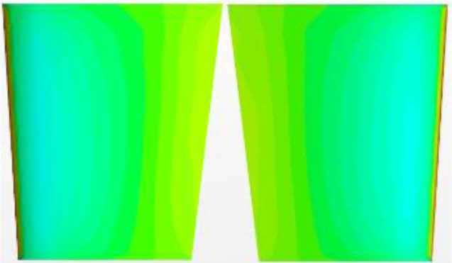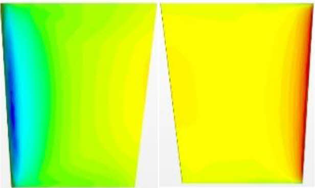 방향타의 타 각이 증가할수록 좌현은 흡입면, 우현은 압력면으로 압력차이가 증가하는 것을 확인할 수 있었다. 이는 날개 양력면 이론에도 확인할 수 있는 듯이 날개의 받음각이 증가할수록 두 면의 압력차로 양력이 증가하는 것을 압력 분포로도 확인할 수 있다. Fig. 4 Fig. 5