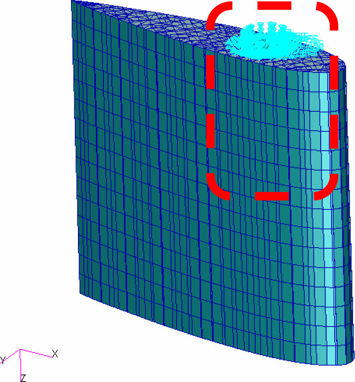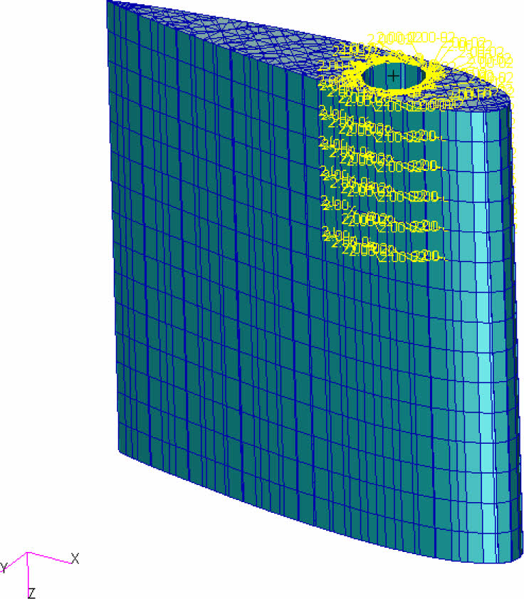 삼각형, 사각형, 육각형 내부 위상 형상을 가지는 3D 프린트 방향타를 모델링하였으며 상용 소프트웨어인 Patran/Nastran 2023.2를 사용하여 구조해석을 수행하였다. Fig.7-9는 각 3D 프린트 방향타의 구조해석 모델이다. 3가지 방향타 모델의 곡면을 고려하여 모든 면에 4개의 절점으로 이루어지는 Quad4 요소를 10 mm 간격으로 모델링 하였다. 육각형 형상을 가지는 모델의 경우 총 4015개의 요소를 가지며 내부 형상은 3055개의 요소로 이루어져 있다. 사각형 형상을 가지는 모델의 경우 총 6894개의 요소를 가지며 내부 형상은 4934개의 요소로 이루어져 있다. 삼각형 형상을 가지는 모델의 경우 총 9486개의 요소를 가지며 내부 형상은 7680개의 요소로 이루어져 있다. Fig. 8 Fig. 9