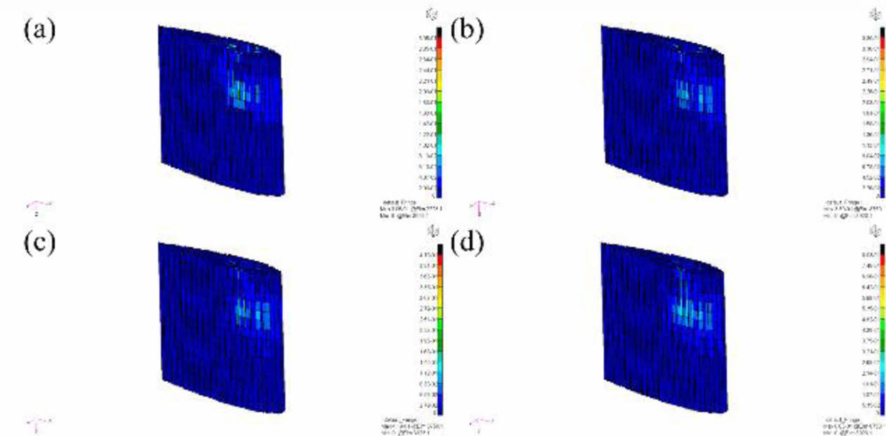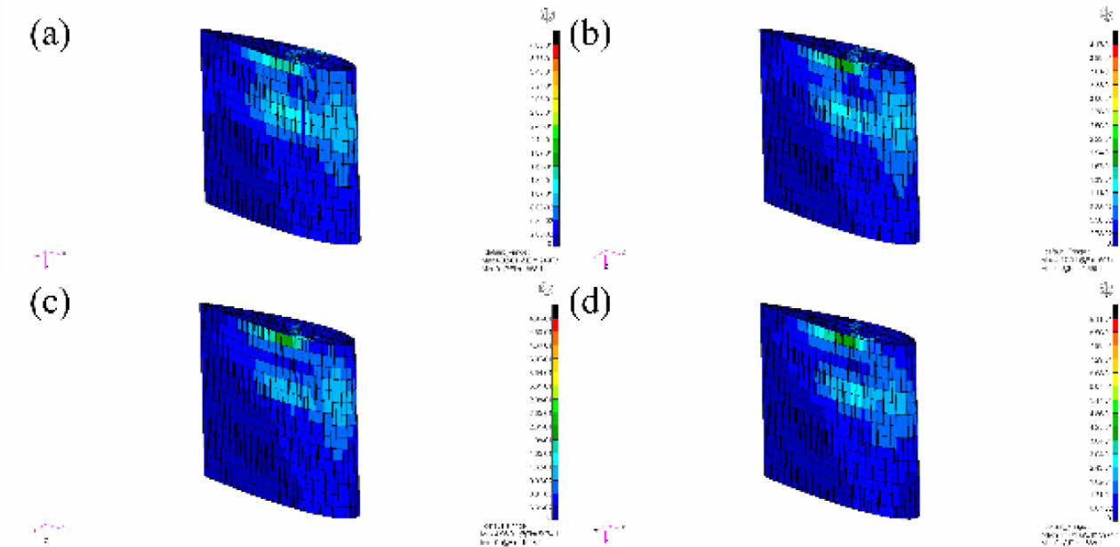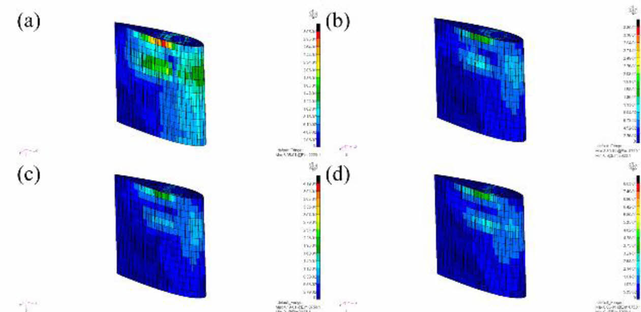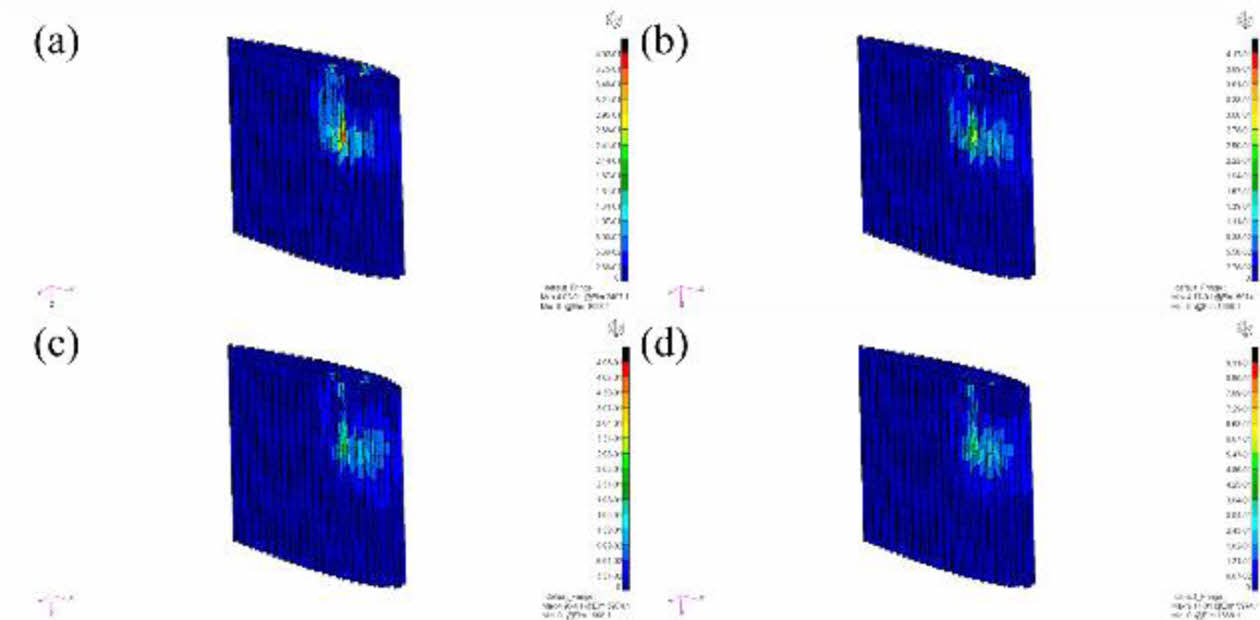 Fig. 13 Stress results of 3D printed rudder with hexagonal topology shape: (a) 0° (b) 10° (c) 20° (d) 30° |
