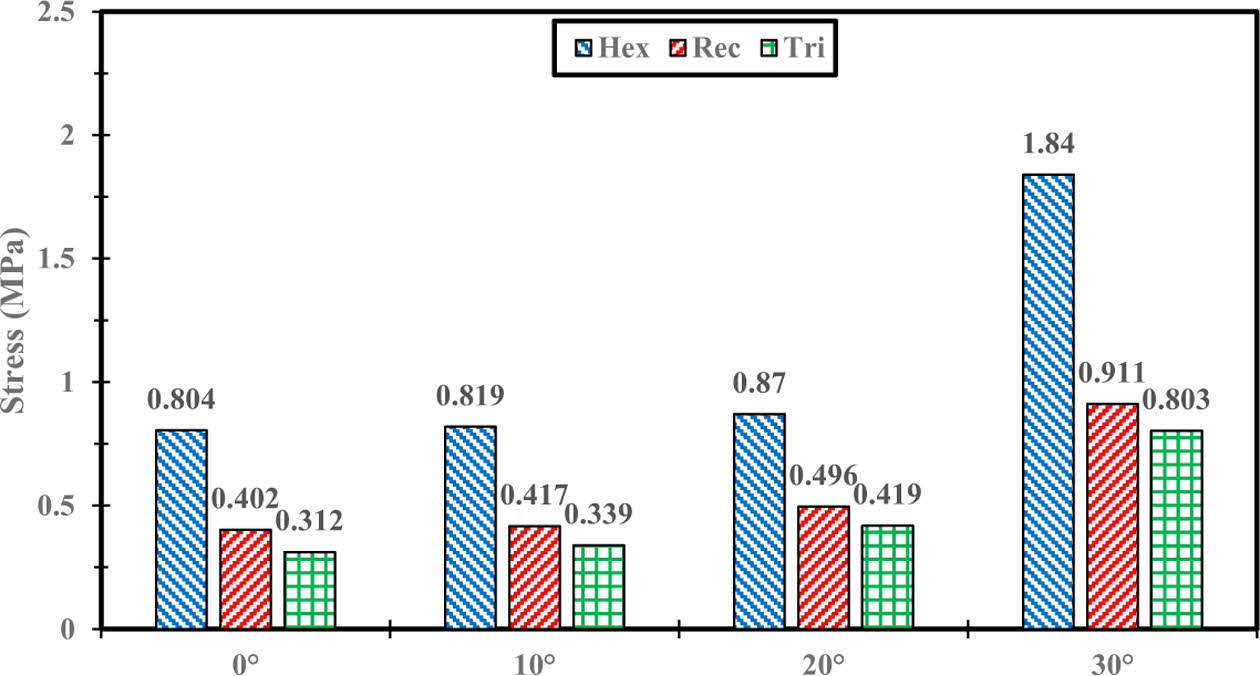 Fig. 16 Stress results of internal hexagonal topology shape: (a) 0° (b) 10° (c) 20° (d) 30° |