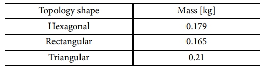 Fig. 13-22은 육각형, 사각형, 삼각형의 내부 위상 형상을 가지는 3D 프린트 방향타들의 0°에서 30°까지 10° 간격으로 변하는 타 각에 대한 구조해석 결과이다. Fig. 13-18을 통해 3가지 모델 모두 최대 응력은 내부 형상에서 방향타 회전축 구멍과 접해 있는 지점에서 나타났음을 확인할 수 있다. Fig. 19를 통해 타 각이 증가함에 따라 최대 응력이 증가하는 경향을 확인할 수 있다. 타 각이 30°일 때 타 각 0°에 비해 육각형 형상의 경우 128%, 사각형 형상의 경우 126%, 삼각형 형상의 경우 157% 증가하였다. 이는 전산유체해석 결과를 보았을 때 타 각이 증가하면서 방향타에 발생하는 압력이 증가하였기 때문이라 판단된다. 내부 위상 형상에 따른 결과를 비교해보면 육각형, 사각형, 삼각형 순으로 높은 응력이 발생하는 것을 확인할 수 있었다. 이는 삼각형, 사각형, 육각형 형상이 모두 길이가 같은 변을 가질 때 육각형 형상보다 사각형 형상이 굽힘 성능이 좋으며[11] 육각형, 사각형, 삼각형 순으로 방향타 내부를 구성할 수 있는 부피가 증가하기 때문에 동일한 하중이 작용하였을 때 낮은 응력이 발생한다고 판단된다. Fig. 20-22은 3가지 모델에 대한 변형 결과를 보여준다. 최대 변형량은 타 각 30°일 때 나타나며 육각형 형상은 0.0657 mm, 사각형 형상은 0.042 mm, 삼각형 형상은 0.0405 mm으로 방향타의 크기에 비해 거의 변형이 없음을 보였다. Table 2은 육각형, 사각형, 삼각형 내부 위상 형상의 3D 프린트 방향타들이 제작되었을 때의 무게를 보여준다. 내부 위상 형상이 육각형 형상인 경우 0.179 kg, 내부 위상 형상이 사각형 형상인 경우 0.165 kg, 내부 위상 형상이 삼각형 형상인 경우 0.21 kg으로 나타나며 사각형 형상의 경우 삼각형 형상 대비 78.5%의 무게를 가진다. Fig. 14 Fig. 15 Fig. 16 Fig. 17 Fig. 21