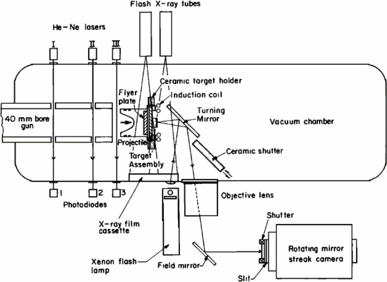 폭발물을 활용한 방식은 오늘날에도 일부 고압 실험에 사용되며[15], 대부분의 재료에 관한 충격파 상태 방정식은 이러한 폭발 시스템을 사용하여 계산되었다. 하지만 하나의 폭발물 설계에 대해 유도 응력의 범위가 작고, 대형 폭발물 발사 시설을 갖춘 실험실로 제한되었다. 시료를 테스트하기 위해 초기 압력을 더 잘 제어하고 더 쉽게 접근할 수 있는 충격파 시설이 필요했기 때문에, 가스(아르곤 또는 수소)를 사용하는 건(gun) 튜브 기술이 개발되었다. 초기에는 Fig. 4와 같은 가스 건을 사용하여 금속 발사체를 시료와 부딪히는 방식을 이용하였다[16].