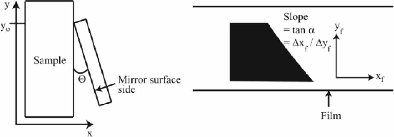 충격파를 받은 물질의 자유 표면 속도를 측정하는 스트릭 카메라 기법은 Fig. 9과 같이 시료 위에 작은 각도로 놓인 기울어진 거울의 앞면에 충격을 가할 때 자유 표면의 경로를 기록한다[14]. 자유 표면이 거울에 충격을 가하면 표면 반사율 변화로 인해 반사광의 세기가 감소하고, 이는 스트릭 카메라에 의해 기록된다. 고정 각도 q의 경우, 거울에서 시료표면 까지의 x거리는 (y0-y)tanq이며, 여기서 y0는 시료 표면에서 거울의 원래 접촉점이다. 움직이는 자유 표면이 거울 표면에 접촉하면 접촉 지점이 Y축 아래로 이동하여 스트릭 카메라의 기록장치에 선이 생기고 이 선의 기울기는 표면 속도와 직접 관련이 있다. 유리의 충격이 샘플과 거울 표면의 닫힘 속도보다 느려지도록 q는 작아야 한다 (일반적으로 약 3o). 그렇지 않으면 측정하는 속도는 충격을 받은 시료의 자유 표면 속도가 아니라 유리의 충격 속도이기 때문이다. 이 실험 기법은 잘 설계된 실험의 자유 표면 속도를 1~2%의 정확도로 측정할 수 있다. 일반적으로 자유 표면 속도는 다음과 같은 식을 통해 얻어지며,