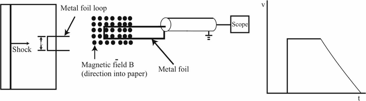 비전도성 물질(예: 플라스틱, 유리, 세라믹, 비금속 폭발물)의 경우 물질의 속도를 측정하는 유용한 기술 중의 하나는 Fig. 10과 같이 전자기 유도를 사용하는 것이다. 먼저 시료 전체에 균일한 자기장을 설정한다. 얇은 호일 루프(보통 알루미늄)를 시료 물질 내부에 배치하여, 물질을 통과하는 충격파가 호일이 시료의 입자 속도로 자기장을 통과하도록 유도한다. 패러데이의 전자기 유도 법칙 V=upBL에 따라, 자기장을 통과하는 호일 루프에 전압 V가 유도된다. 이 식에서 B는 자기장 강도, L은 전계선에 수직인 와이어 또는 호일의 길이, up는 자기장에 수직인 호일 속도이다. 각국의 연구소에서는 폭발 개시 및 특성 분석을 위한 건 활용 충격 실험의 표준 진단 도구로 사용하고 있다[38-40]. 이 방식의 시간 분해능은 호일 두께에 따라 10~70 ns이며, 제한 사항으로 시료나 발사체에 금속이 있을 수 없다는 것이다. 금속이 자기장 속에서 움직이면 전기적 노이즈와 기록의 왜곡이 발생하기 때문이다.