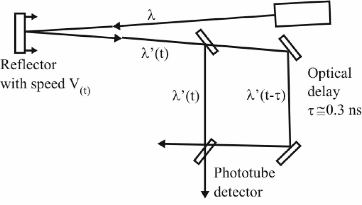 레이저를 활용한 충격파 생성 방식이 도입되면서, 충격파의 상승시간이 수 나노초로 제한되었기 때문에, 나노초의 분해능 측정 기술로써 간섭계 방식이 활용되었다. 본 논문에서는 대표적인 3가지 간섭계 방식을 설명한다. 반사 표면을 사용하는 레이저 속도 간섭계(Velocity interferometer system for any reflector, VISAR)는 시료 표면의 속도 또는 시료와 맞닿아 있는 광학 창 재료 사이의 계면을 측정한다. 광학 창은 충격파의 압력을 측정하는 데 사용되며, 자유 표면 속도는 광학 창을 사용하지 않을 때 측정된다. Fig. 11에는 가상의 속도-시간 그래프와 광 튜브 검출기 출력이 포함된 VISAR 방식의 간단한 개략도가 나와있다[41]. VISAR에서 레이저 빔은 움직이는 표면에서 반사된 후 두 개의 빔으로 분할되고 한 빔은 렌즈 또는 에탈론으로 만들어진 지연 시스템을 통과한다. 분할된 빔은 검출기에서 결합되며, 결과 비트 주파수는 지연 간격 동안의 속도 변화(즉, 가속도)에 비례한다. 프린지를 계산하면 총 속도 변화를 알 수 있다. 이론적 시간 분해능은 일반적으로 피코초 이지만, 프린지를 감지하기 위해 광배율을 사용하면 나노초 시간 분해능으로 제한된다. 크기가 작고 비교적 저렴하지만, 급격한 속도 변화에 문제가 있으며, 프린지 점프 모호성을 해결하기 위해 시스템에 내장된 두 번째 에탈론에 의존하게 된다. 일반적으로 50~200 μm의 레이저 빔 면적 직경에 걸쳐 평균 속도를 측정하는 단일 지점 측정이 이루어진다.