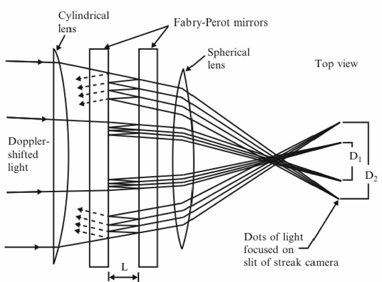 Fabry-Perot 간섭계 방식의 개략도, 가상의 속도-시간 그래프 및 스트릭 카메라 기록을 Fig. 12에 나타내었다[42]. 이 방식은 정확히 평행하게 정렬된 두 개의 평평한 반사 표면이 서로 마주 보는 구조로 이루어져 있다. 왼쪽 거울을 통과한 빛은 양쪽 반사판을 통해 모두 새어 나갈 때까지 두 거울 사이에서 앞뒤로 튕기며 부분적으로 갇히게 된다. 빛이 이 다중 반사 경로를 통과하는 데 걸리는 시간에 따라 광학 지연 시간이 결정되며, 이 시간은 평행한 거울 사이의 거리를 변경하여 조정할 수 있다. 지연 시간은 5~20 ns이며, 이는 이 방식의 시간 분해능이기도 하다. 들어오는 레이저 빛을 향해 가속하는 물체의 경우 빛의 주파수가 증가하여 프린지 패턴이 확장된다. 목표물에서 반사된 빛은 원통형 렌즈를 통과하여 수평면에서 빔을 수렴하는데, 이렇게 하면 프린지 패턴의 각 고리가 한 쌍의 밝은 점으로 변환된다. 이 점들은 스트릭 카메라의 슬릿 평면에 초점을 맞춰 각 라인 쌍을 시간 순서대로 기록되며 선들의 분리 거리는 속도 변화에 비례한다. 기록 길이는 짧으며 데이터 분석 또한 간단하다. 즉 충격이 가해진 표면에 선 이미지를 집중시켜 움직임을 측정한다. 충격파 실험에 사용되는 Fabry-Perot 간섭계는 일반적으로 맞춤 제작되어 사용한다.