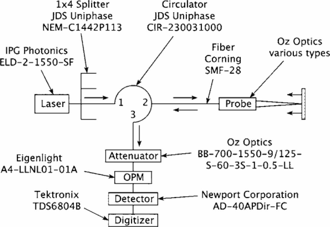 Heterodyne 간섭계는 파장이 약간 다른 두 개의 광선을 혼합하여 그 차이 또는 “비트” 주파수에 해당하는 검출기 출력을 생성한다. Heterodyne 간섭계의 개략도를 Fig. 13에 나타내었다[43]. 레이저는 먼저 움직이는 표면에서 반사된 빛의 도플러 효과를 얻기 위해 사용되며, 이후 도플러 이동이 일어난 빛과 직접적인 레이저가 결합되어 비트 주파수가 생성된다. 도출된 속도-시간 그래프는 비트 파형의 주파수와 연관되며, 데이터 분석은 여러 이산 속도와 푸리에 변환 기법을 사용한다. Heterodyne 간섭계는 결합된 광 신호에서 필요한 비트 주파수의 분해능을 얻기 위해 통신 업계에서 주로 사용되는 광섬유 레이저, 순환기 그리고 높은 대역폭과 샘플링 비율을 가지는 디지타이저가 필요하다. 이 시스템은 VISAR 및 Fabry-Perot 간섭계와 같은 프린지 점프 모호성이 없으며 매우 긴 기록을 기록할 수 있다. 또 다른 장점은 잘 설계된 실험에서 여러 표면 속도를 1%의 정확도로 측정할 수 있다는 것이다.