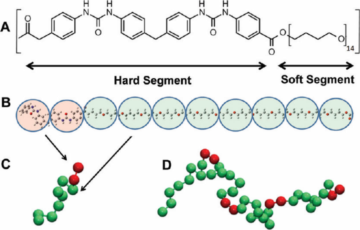 Fig. 14 Molecular structure of polyurea consisting of hard and soft segments. Green sphere indicates the soft segment, red one represents the hard segment, where each forms nano-phase clusters |