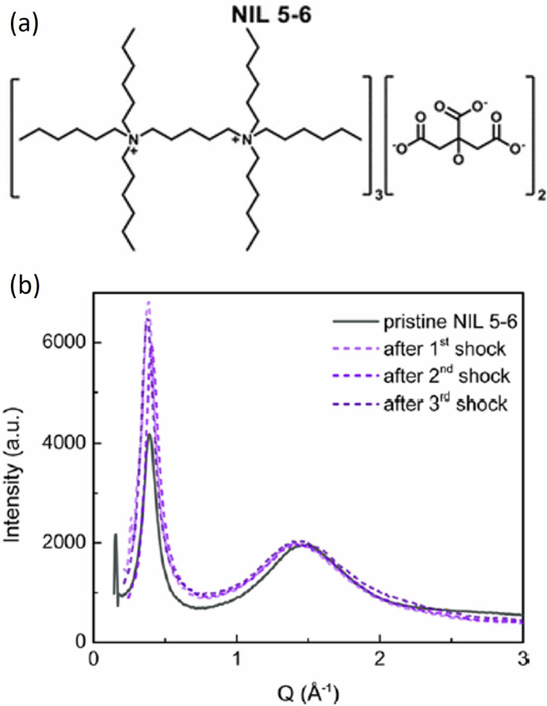 Yang 등은 알킬-다이암모늄 양이온 (alkyl-diammonium cations)과 시트레이트 음이온 (citrate anions)으로 구성된 네트워크 형성 이온성 액체(NILs)를 연구하였다[28]. 양이온의 긴 알킬 촉쇄(alkyl side chain)는 결정화를 어렵게하여 냉각 시 비정질 유리질 고체가 형성되도록 한다. 긴 알킬 사슬을 가지는 NIL은 짧은 알킬 사슬을 가진 NIL보다 더 많은 충격파 피크 압력을 감쇠했다. X-ray 회절 데이터에 따르며 충격파에 노출된 후에 나노 상분리에 직접적으로 연관된 peak이 더 높은 intensity를 가짐을 확인할 수 있는데, 이는 충격파에 의한 나노 상분리 유도 현상으로 여겨진다(Fig. 15).