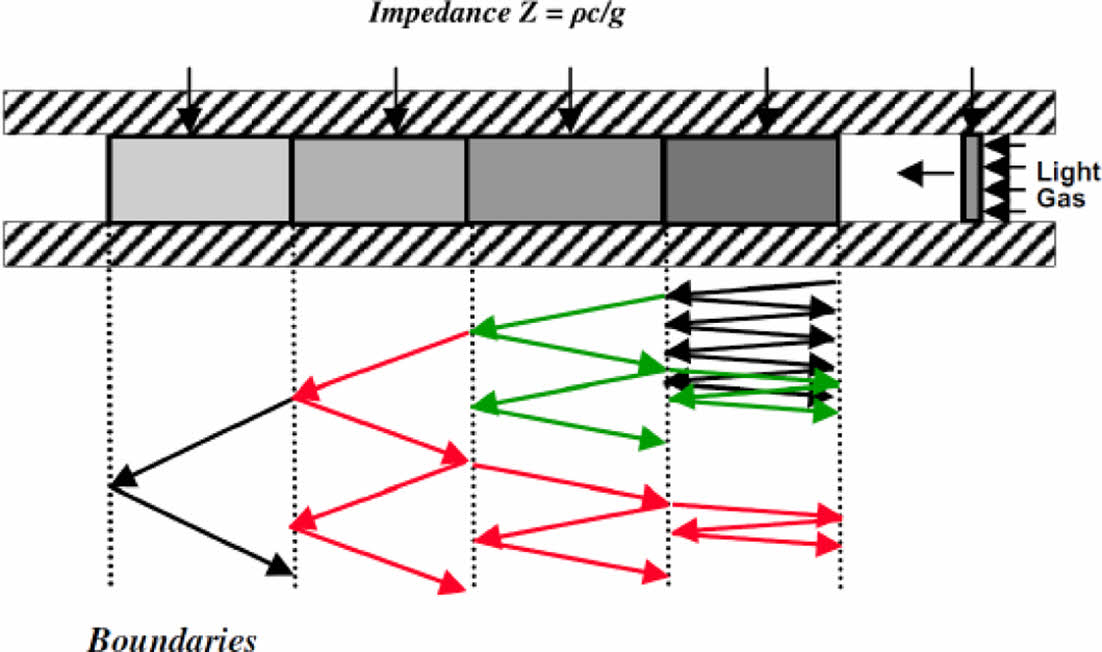Fig. 16 Schematic depiction of stress propagation through a multi-layered structure via transmissions and reflections at the interfaces [55] |