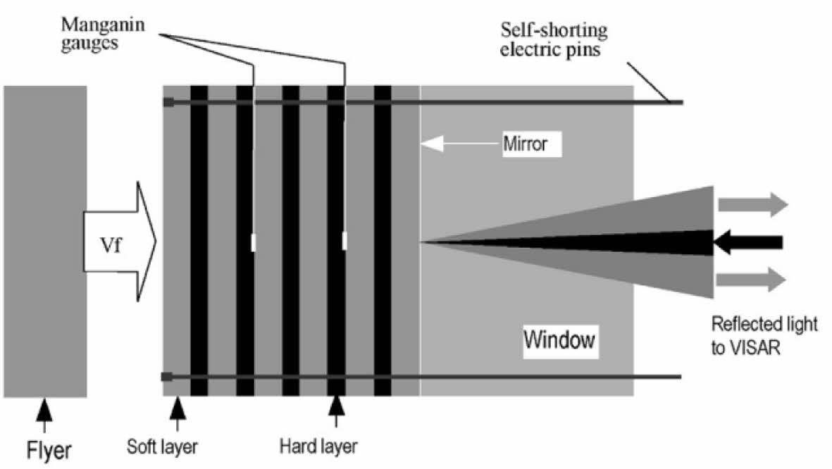 Zhuang 등은 주기적으로 적층된 폴리카보네이트 (Polycarbonate)와 금속 층 사이의 계면에서의 산란 효과를 실험적으로 조사하였다(Fig. 17). 기계적 임피던스가 큰 구성요소인 금속을 경질 (hard) 층이라 하고, 기계적 임피던스가 낮은 폴리카보네이트를 연질 (soft)층이라고 명명하였다. 첫 번째 층이 단위 셀에서 항상 연질층이 되도록 복합재 층을 순서화하였다. 실험 결과에 따르면 계면 산란으로 인해 충격파의 완화와 연관된 변수인 충격파 점도(shock viscosity)는 계면 임피던스 불일치의 증가와 함께 증가하고, 계면 밀도 및 충격파 압력의 증가와 함께 감소한다. 균일한 금속에 대한 충격파 점도보다 layered composite이 계면/미세 구조 산란으로 인해 훨씬 더 큰 충격 점도를 가짐을 나타낸다. 또한 실험 결과는 산란 효과로 인해 layered composite에서의 충격 전파가 극적으로 느려지고, 복합재료의 충격 속도가 구성 요소 중 어느 것보다 낮을 수 있음을 보여준다[59]. Petel 등은 상이한 두께를 갖는 다층 복합재에서, 얇은 층이 충격파 분산에 더 효과적이라고 보고했으며, 계면에 걸친 응력 평형에 대한 등가 시간 척도(equivalent time scale)가 충격파 감쇠에 중요한 역할을 한다는 것을 입증했다[60].