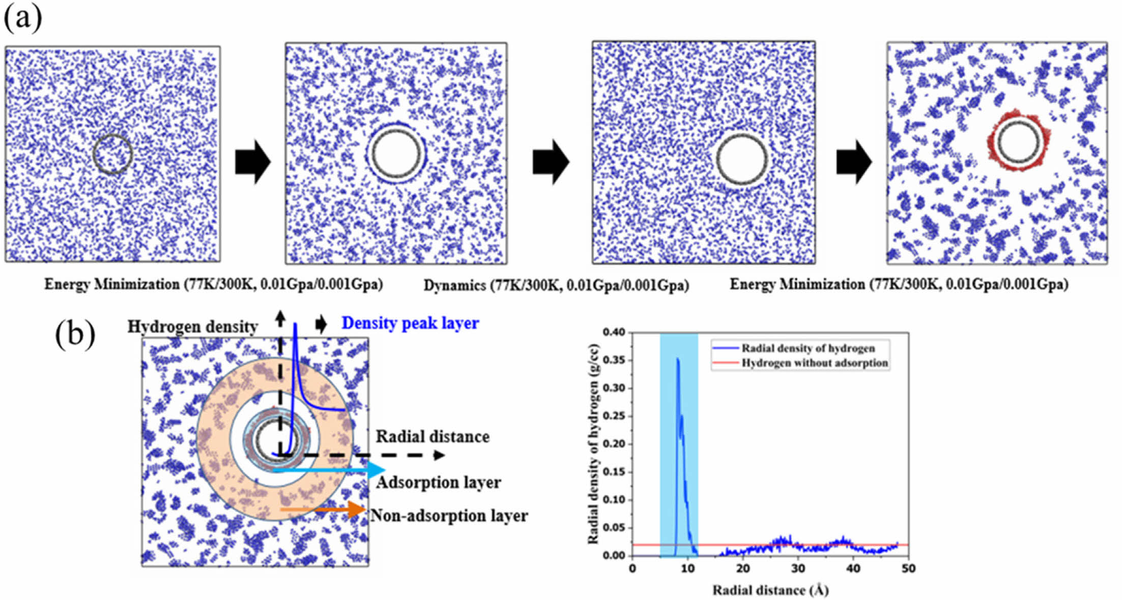이와 같은 미시구조 상에서의 설계 변수에 따른 영향을 평가하고, 설계에 반영하기위해, 최근 분자동역학 해석을 활용하여 나노튜브 기반의 복합재의 수소 저장 거동을 규명하고 성능을 평가하는 연구가 활발하게 진행되고 있다[22,24,27]. 나노튜브를 활용한 고체수소저장 연구 결과에서, 고체수소를 저장가능한 영역은 크게 세 가지로 나뉜다. 1) 나노튜브 표면을 통한 저장: 나노튜브 표면과 수소의 전기적 인력을 통해 물리 흡착의 방식으로 저장하는 방식이며 세 가지 영역 중 가장 큰 고체수소 저장 분율을 보인다[23,25,26]. 2) 나노튜브 내부 공간을 통한 저장: 기체상의 수소가 나노튜브 내부로 들어가게 되어 물리적 저장을 하는 방식이다[31,32]. 3) 나노튜브 다발(bundle)의 내부 침입: 다발의 나노튜브 구조에서 보여지는 현상으로 나노튜브 간 공간에 침입하게 되어 저장되는 방식이다[24,31,32]. 기존 단일 벽 탄소나노튜브의 경우 Lyu[32]의 논문에 따르면 0.5~5 wt%의 저장과 Pt, Al 등의 금속 도핑과 다양한 구조 도입등에 따라 ~8 wt%까지 수소 저장이 가능함을 시뮬레이션을 통해 확인되었다.