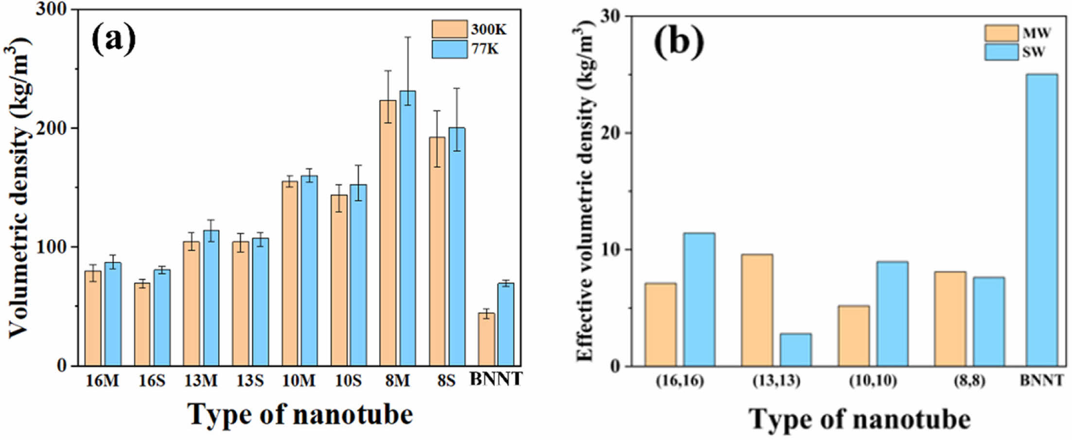 Fig. 3 (a) The hydrogen storage density of studied nanotube models. The numbers on the x-axis represent the number of nanotube models (n,n), M represents a multi wall structure, and S represents a single wall structure (b) The effective volumetric density of studied nanotube models, which is the value obtained by subtracting the storage amount under the desorption from the storage amount under the adsorption |