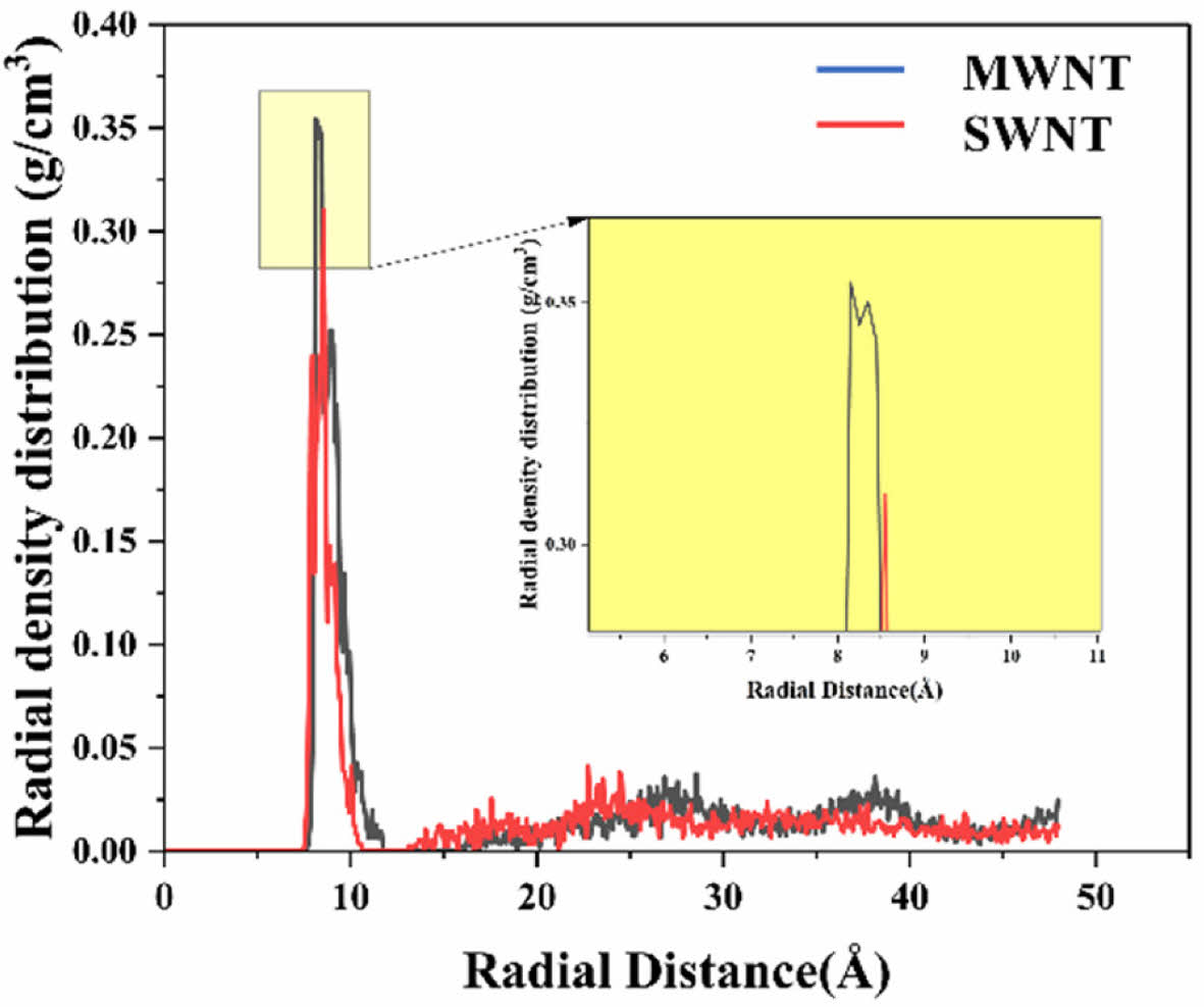 Fig. 4 Comparison of radial density functions of MWNT and SWNT(8,8) |