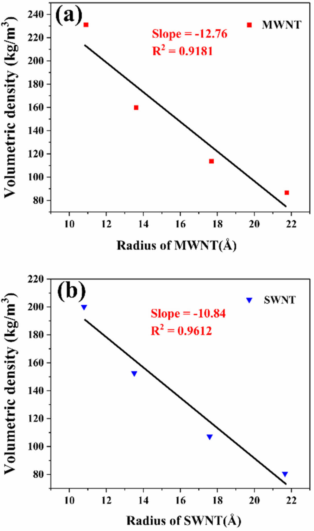 Fig. 5 Variation of hydrogen storage (via volumetric density) depending on the radius of nanotube with linear fitting curve to evaluate the sensitivity of storage: (a) MWNTs, (b) SWNTs |