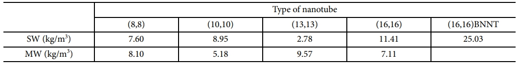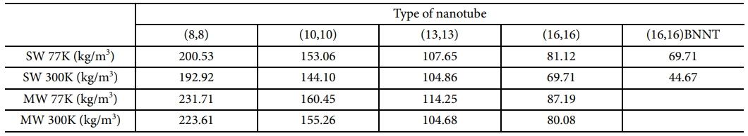 나노튜브 종류에 따른 따른 고체수소 저장량의 영향을 평가하기 위해 (16,16)의 동일 반지름을 지닌 단일 벽 탄소나노튜브와 붕소-질소 나노튜브를 도입하여 시뮬레이션을 수행하였다.