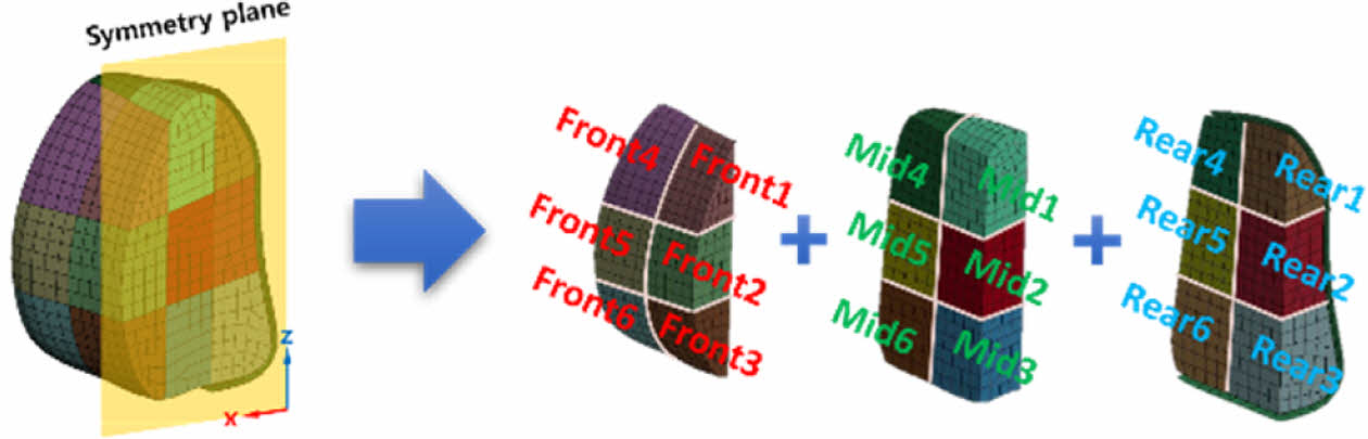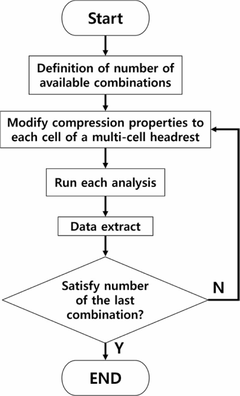 데이터셋 구축을 위해 Fig. 5에서와 같은 흐름으로 구동되는 데이터셋 생성 프로그램이 Python을 통해 개발 및 적용되었으며, multi-cell headrest의 각 cell에 적용될 수 있는 압축 특성 분포의 가용 조합 생성 및 적용, mini sled test 해석 수행, 데이터 추출 순으로 실행되게 된다. 먼저 프로그램이 실행되면 각 cell에 soft와 hard한 압축 특성을 나타내는 stress scale factor가 총 12개의 cell(Front와 Mid 각 6개)에 부여될 수 있는 전체 가용 조합이 생성되게 되며, 이때 생성된 총 조합의 개수는 4,096개로 전체 해석 시 소요되는 computing time을 고려하여 2,048개의 조합이 랜덤으로 추출 및 적용되게 된다. 추출된 조합은 mini-sled test해석에서 각 cell의 압축 특성에 할당되게 되고 LS-DYNA를 통해 곧 바로 해석 수행이 이루어지게 된다. 해석이 완료되면 각 cell에 적용된 12개의 압축 특성과 3개의 해석 결과로 총 15개의 특성이 하나의 데이터를 형성하게 된다.