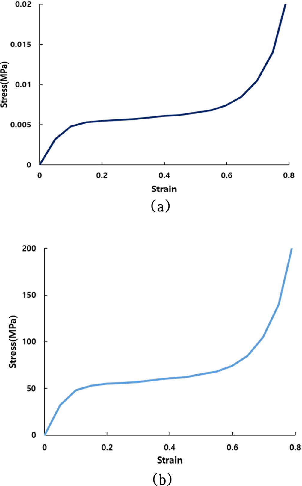 Multi-cell headrest의 베이스 형상은 NHTSA(National Highway Traffic Safety Administration)에서 제공하는 2010 Toyota Yaris Passenger sedan의 조수석 쪽 headrest FE모델이 적용되었으며, 해당 headrest 형상은 무게중심에서 X, Y, Z면을 등간격으로 하여 총 24개의 cell로 분할되었고 각각 개별적인 part로 구성되었다. Fig. 1은 multi-cell headrest가 인체모형의 시상면 기준으로 대칭인 것을 나타내며, 해당 대칭면을 기준으로 총 18개의 분할된 cell 형상으로 이루어져 있음을 알 수 있다. 생성된 multi-cell headrest는 Fig. 1에서와 같이 후두부와 가장 가까운 면에서부터 Front, Mid, Rear 순으로 구성되고 각각의 cell에는 headrest foam의 압축 특성이 랜덤으로 배치되게 된다. 이때 배치될 수 있는 압축 특성의 전체 조합의 수가 곧 생성되게 될 데이터의 개수가 되며, 유한요소해석 시간을 고려한 충분한 데이터 확보를 위해 각 cell에 랜덤 적용될 foam의 압축 특성은 soft와 hard로 선정되었다. 해당 특성에는 선행 연구[8]에서 압축 시험을 통해 도출된 headrest foam의 압축 응력-변형률 선도가 적용되며, soft와 hard한 압축 거동 구현을 위해 적용된 선도의 응력값에 104만큼 stress scale factor가 적용되었다. Fig. 2(a)는 soft한 압축 특성을 나태는 선도를 나타내며, Fig. 2(b)는 hard한 압축 특성을 나타낸다. 마지막으로 Rear에 위치한 cell은 후두부 충격 시 상해지수에 미치는 영향도가 가장 낮게 도출되어 해당 cell에는 hard한 압축 특성으로만 배치되게 되었다[8].