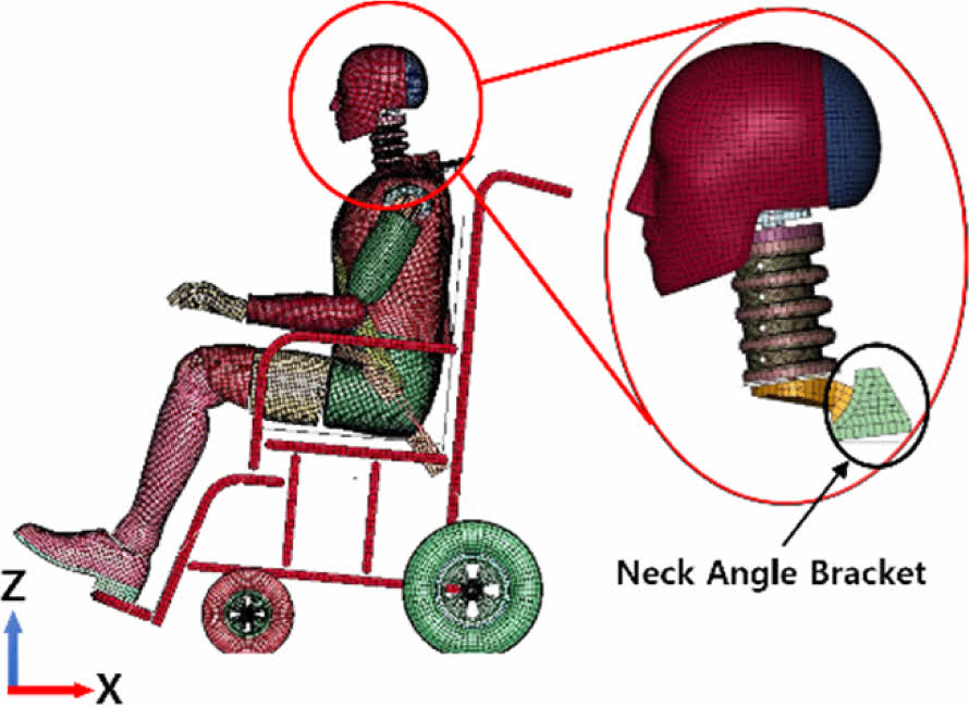 저속 후방 추돌 해석에 적용될 더미는 Hybrid III 50th percentile male dummy가 적용되었으며, 데이터 구축 효율성 향상을 위해 Fig. 3에 제시되어 있는 neck angle bracket에서 머리 까지의 FE모델만을 적용하여 mini sled test[9] 해석이 수행되었다. mini sled test 해석에 적용될 저속 후방 추돌 가속도 생성을 위해 우선 전체 더미 모델이 탑재된 휠체어 모델에 FMVSS 202a dynamic testing corridor[10]를 만족하는 저속 후방 추돌 펄스(16 km/h, 9.0 g)를 부여하여 선행 sled test 해석이 수행되었으며, 이후 neck angle bracket에서 추출된 저속 후방 추돌 가속도가 mini sled test에 적용되었다.