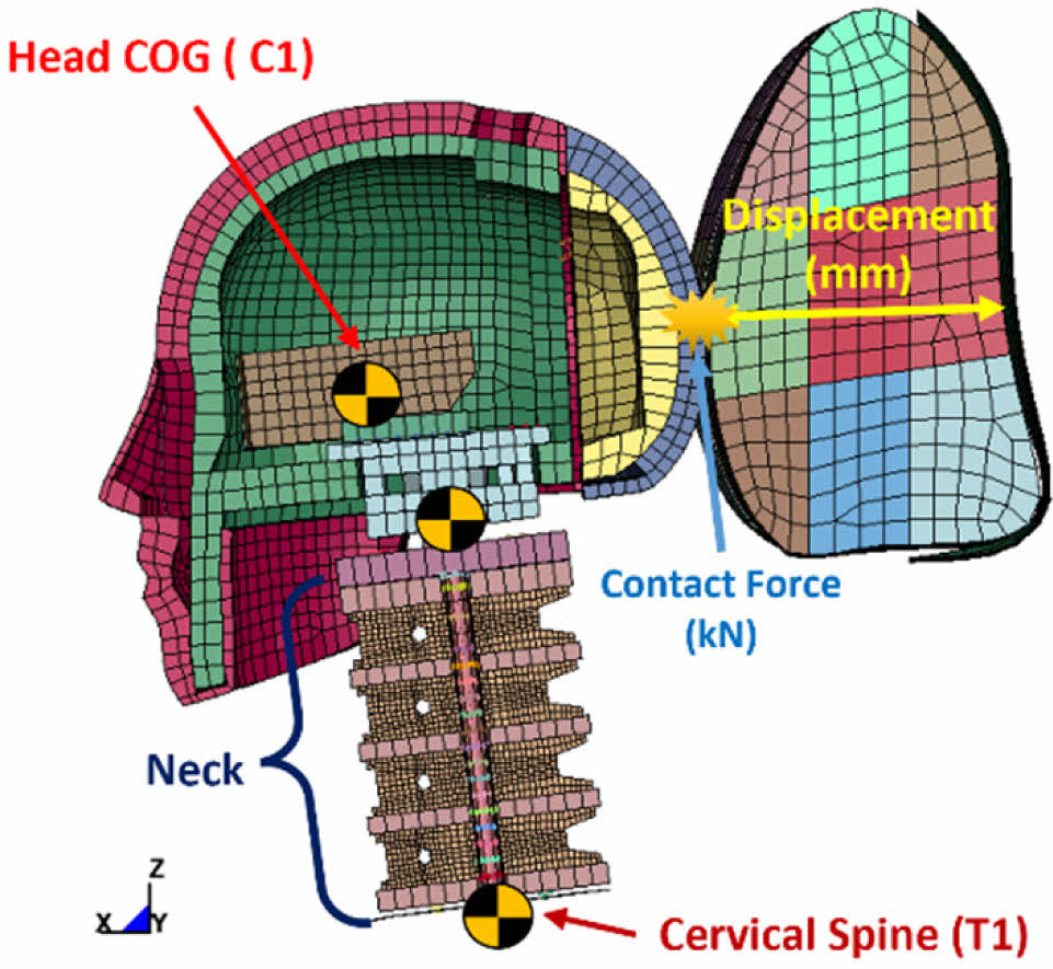 후방 추돌 시 탑승객의 목 부위에서 갑작스러운 회전 운동이 발생하게 되는데, 이는 곧 목의 편타성 손상(Whiplash injury)을 유발하며, 목의 연조직(soft tissue) 손상에 영향을 미치게 된다. 이러한 목 부상 정도를 예측하는 대표적인 지표가 NIC(Neck injury criterion)이다[11]. 해당 상해지수는 Fig. 4에서와 같이 머리무게중심(C1)과 흉추골(T1) 사이의 상대적인 가속도 차이에 따른 경추 압축 부상 가능성에 대한 지표로 식 (1)에 의해 산출된다. 여기서 식 (2)는 머리무게중심과 흉추골 사이의 상대가속도를 나타내며, 식 (3)은 상대가속도를 상대속도로 변환한 것을 나타낸다. 상수 0.2는 일반적인 목의 길이(0.2m)를 의미한다. 따라서 데이터셋 구축을 위한 mini sled test 해석이 진행될 때마다 위 식에 근거하여 최대 NIC가 도출되며, 각 cell에 부여된 압축 특성 분포에 따른 후두부의 multi-cell headrest 충격에 의한 압축 깊이와 contact force가 충격 에너지 흡수량 계산을 위해 추가로 추출되었다.