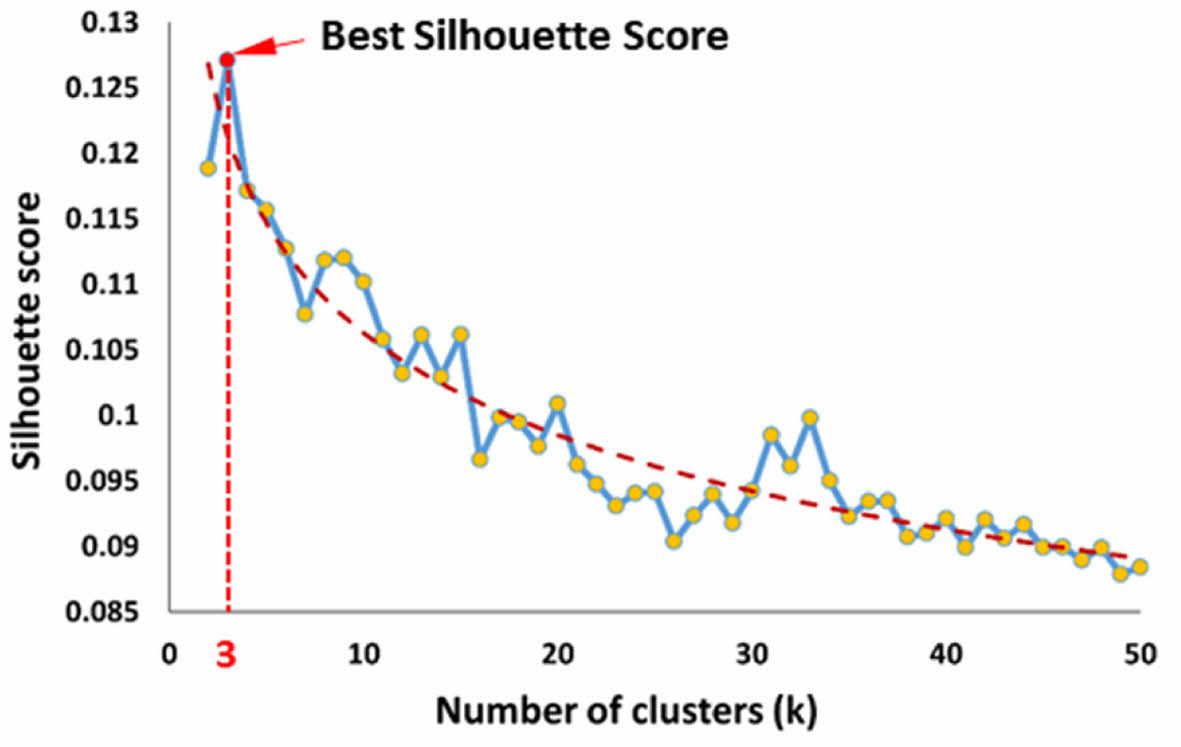 식 (6)을 통해 계산된 각 데이터들의 Si는 다시 mean(Si)로 최종 산출되며, 산출된 해당 평균 실루엣 계수가 1에 가까울수록 군집이 잘 형성되었다 할 수 있다. 본 논문에서는 적절한 k 값 선정을 위해 2~50개의 군집 평가가 수행되었다. 결과는 k = 3에서 실루엣 계수가 0.126으로 최대값을 나타내었으며, 이후 군집 수가 증가할수록 실루엣 계수가 확연히 감소하는 것을 Fig. 6을 통해 알 수 있다. 여기서 실루엣 계수가 0에 가까워진다는 것은 군집 간의 거리와 군집 내의 거리가 비슷하다는 것을 의미하며, 군집화가 잘 수행되지 않았거나 데이터가 명확한 패턴으로 구분되지 않은 것으로 해석될 수 있다. 이는 곧 군집의 품질이 낮다는 것을 의미한다.