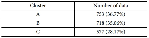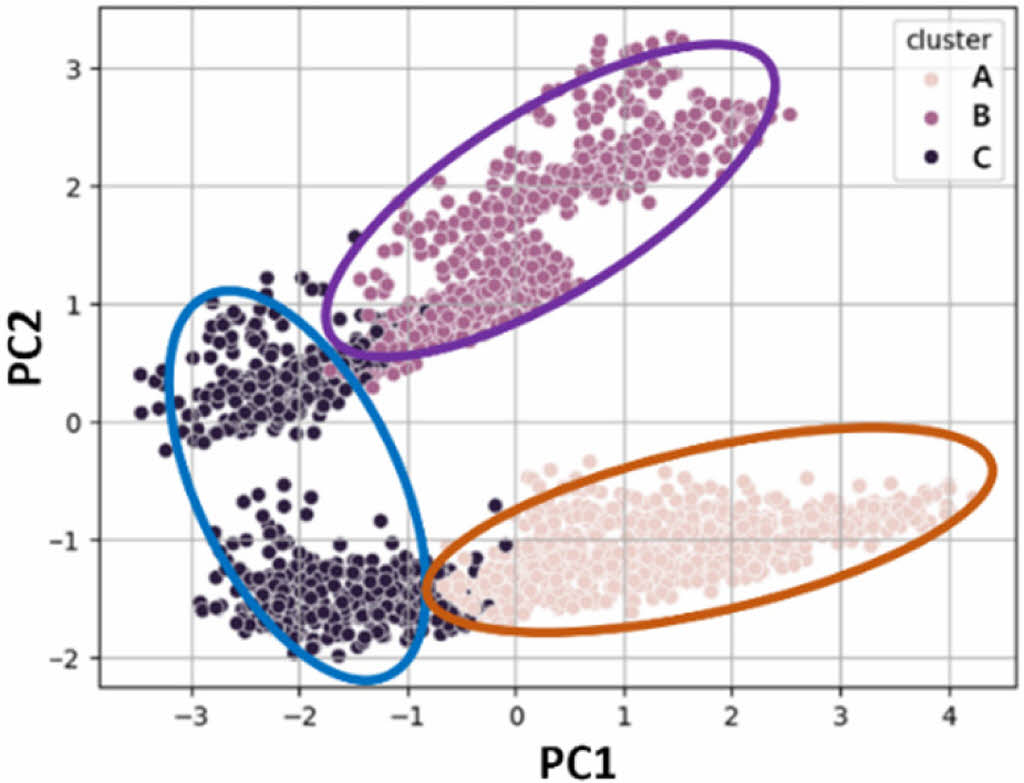 이후 k = 3일 때의 군집 분포 결과를 가시화하기 위해 가장 대표적인 차원 축소 알고리즘인 PCA(Principle Component Analysis)가 수행되었다. PCA는 각 데이터에 가장 가까운 초평면(Hyperplane)을 구한 다음, 모든 데이터를 이 초평면에 투영(Projection)시키는 방식으로 차원 축소를 수행하게 된다. 이때 분산이 커야 데이터들 사이의 차이점이 명확해지기에 전체 데이터들의 분산이 최대가 되는 축을 찾게 되며, 이후 이 첫번째 축에 직교하고 남은 분산을 최대한 보조하는 두번째 축을 찾는다. 이를 통해 15차원을 나타내는 데이터의 15개 특성이 2차원으로 축소되어 군집 분포 가시화가 수행되었다. 가시화 결과는 Fig. 7과 같으며, 여기서 가로축은 분산이 가장 큰 축인 PC1을 의미하고 세로축은 두번째로 분산이 큰 축인 PC2를 의미한다. 형성된 각 군집의 데이터 분포는 Table 1에 나타나 있으며, A와 B군집이 각각 36.77%, 35.06%로 데이터의 개수가 C군집 대비 상대적으로 균등하게 분포되어 있고 C군집은 28.17%로 데이터의 수가 가장 적게 분포되었다. 또한 C군집의 분포 형상은 A와 B군집과 달리 중간에 끊어져 있는 것을 알 수 있다. 이는 고차원 데이터를 저차원으로 축소하게 될 때, 데이터 고유의 분포 특성에 따라 선정된 주축과 그에 따른 투영에 기인한 결과라 할 수 있다.
