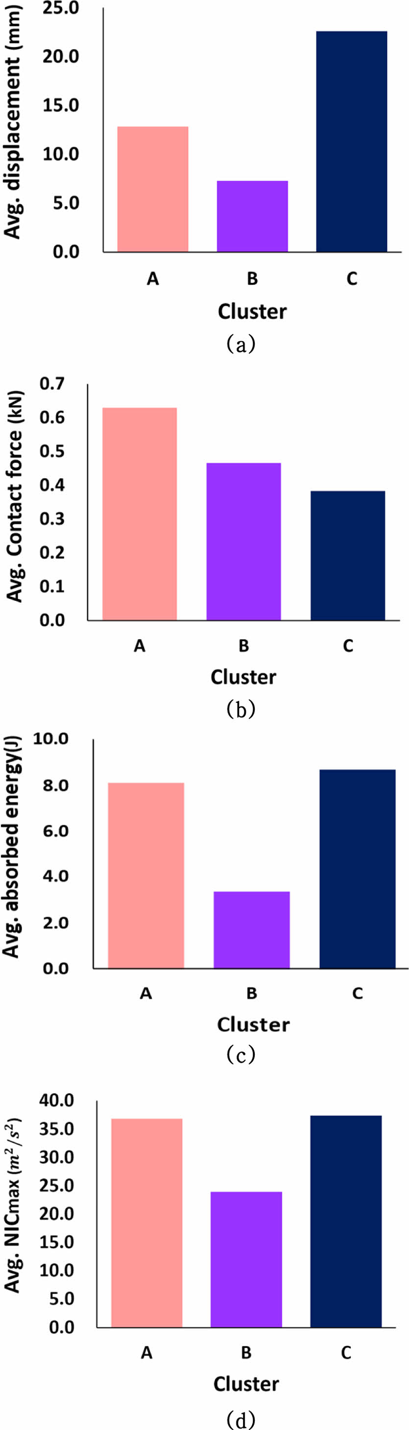 Fig. 8 Average according to each cluster: (a) average displacement, (b) average contact force, (d) average absorbed energy, (d) average NICmax |