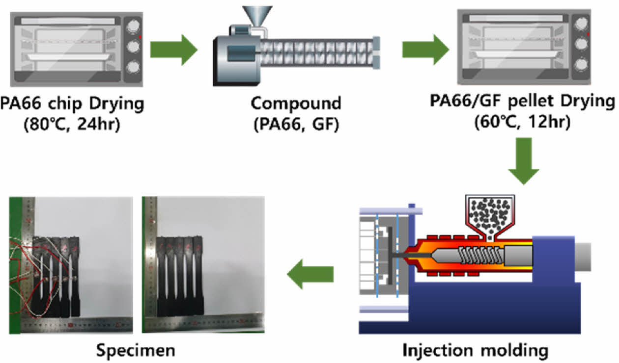 PA를 기지재로 한 섬유강화복합재료의 기계적 물성에 영향을 끼치는 인자는 복합재료 각 성분의 고유한 성질뿐만 아니라 강화재의 배향, 강화재의 길이 및 섬유-수지의 계면에서의 접착력, 물성향상을 위한 첨가제의 유무 등이 있다[8-11]. 강화재와 열가소성 기지재인 PA를 혼합하여 복합재료를 제조하기 위한 방법으로써 injection molding, pultrusion, filament winding 등이 있다. 일반적으로 PA를 기지재로 한 복합재료를 제조하기 위하여 injection molding 방법을 사용하고 있으며, 강화재와 기지재의 물성을 최대한 유지하면서 강화재가 지니고 있는 탄성률이나 강도 등의 기계적 물성을 최대한으로 이용하기 위한 공정 변수 설정이 중요하다[12-16].