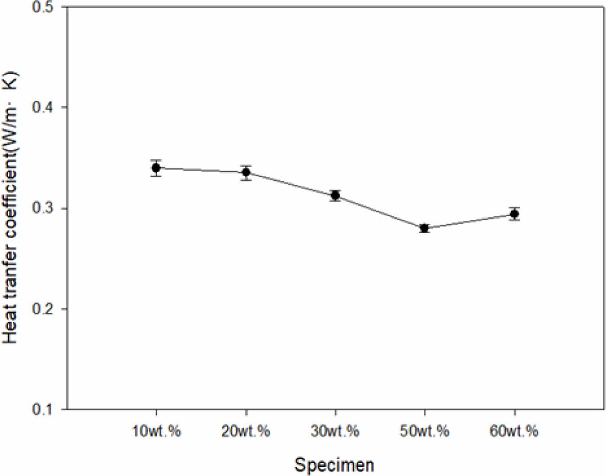 강화재 함량에 따른 열가소성 복합재료의 열전도계수 결과값들을 Fig. 2에 나타내었다. 열가소성 복합재료내 강화재 함량이 증가할수록 열전도계수가 감소하는 경향을 나타내었으며, 이는 고온에 의한 저항성이 높음을 의미한다. 강화재 함량이 50 wt.%인 경우에 상대적으로 가장 낮은 열전달계수를 나타내었다. 열가소성 복합재료내 강화재 함량이 60 wt.%인 경우, 강화재 함량이 50 wt.%인 경우에 비하여 열전달계수가 7.5% 이상 증가한 값을 나타내었는데, 이는 강화재 함량이 과도하게 높아지게 되면, 반데르발스 인력 및 유리섬유 사이의 상호작용으로 인하여 고분자 매트릭스(matrix)내 강화재가 고르게 분포되지 못하고 응집현상이 발생하여 내열성이 오히려 감소한 것으로 판단된다. 열가소성 복합재료내 강화재가 과도하게 분포하게 되면 오히려 빈 공간이 늘어나기 때문에, 열전도계수가 급격하게 증가한 것으로 판단된다. 강화재 함량이 10 wt.%인 샘플은 강화재의 질량분율이 50 wt.%인 경우와 비교하여 29.5% 증가한 값을 나타내었다.