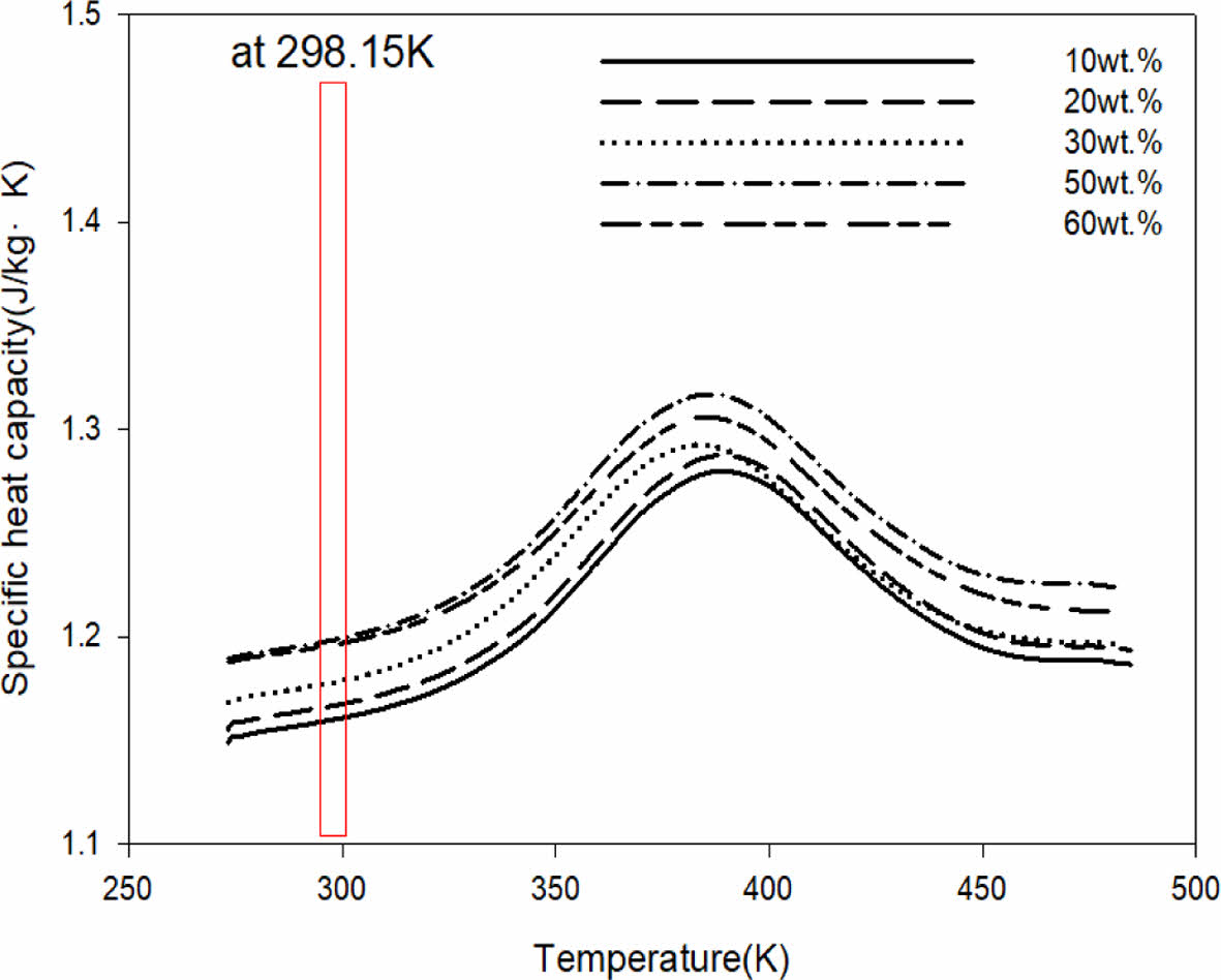 강화재 질량 분율에 따른 비열 결과값들을 Fig. 3에 나타내었다. 열전도계수 결과값와 마찬가지로 팽창성 그래파이트의 질량분율이 50 wt.%인 경우에 비열값이 가장 높게 나타났다. 하지만 강화재 질량분율이 60 wt.%일 때의 비열값과 질량분율이 50 wt.%일 때의 비열값을 비교해보았을 때, ±3% 이내의 근사치를 나타내었다. 비열의 경우에는 강화재 사이의 응집현상에 상대적으로 크게 영향을 받지 않는 것으로 사료된다.