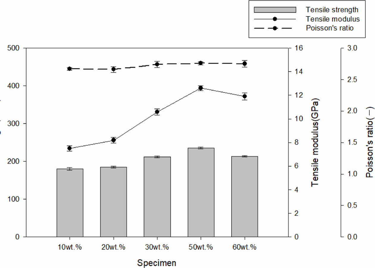 Fig. 4 Tensile propeties according to the mass fraction of the GF |