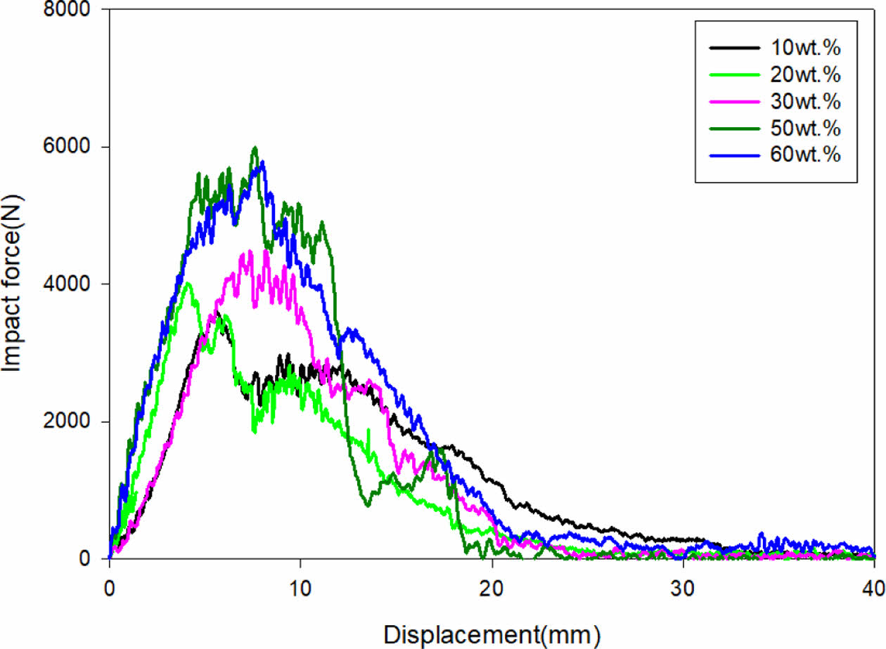 강화재 질량분율에 따른 내충격성 분석결과를 Fig. 5에 나타내었다. PA66/GF 열가소성 복합재료를 제조할 때, 강화재의 함량이 높을수록 내충격성이 향상되는 결과를 나타내었다. 강화재의 질량분율이 60 wt.%일 때 maxmimum peak force 값은 강화재 질량분율이 10w t.%일 때의 결과값과 비교하여 52.7% 향상되었다. 복합재료내 유리섬유의 함량이 높을수록 인장강도 및 굴곡강도, 충격강도가 향상된다는 연구결과가 있다[25]. PA66 소재의 경우, rubbery한 특성으로 인하여 외부 충격하중에 따른 충격저항성이 있지만 강화재인 유리섬유의 강화효과가 더 뛰어나기 때문에, 강화재인 유리섬유의 질량분율이 높아질수록 내충격성이 향상된 것으로 판단된다. 강화재의 질량분율이 60 wt.%일때는 유리섬유간 얽힘 현상으로 인한 응집현상(aggregation)이 발생하였으나, 일정수준의 외부 하중에 따른 충격강도는 해당 현상에 의한 영향이 거의 없는 것으로 사료된다.