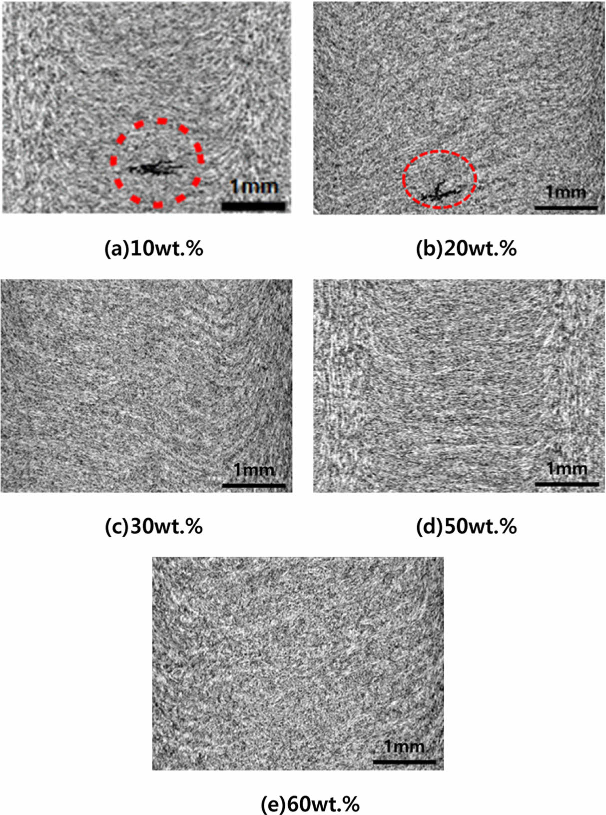 Micro-CT를 활용한 강화재 함량에 따른 PA66/GF 열가소성 복합재료 표면의 형태학적 분석 결과를 Fig. 6에 나타내었다. PA66/GF 열가소성 복합재료 시편의 중앙부분에서만 길이 방향으로 일정하게 배향된 것을 확인하였다. PA66/GF 열가소성 복합재료 사출 성형 시, 사출압력 및 고온에 의한 금형 내에서의 수지 흐름은 금형 벽면에 고화층을 형성하기 때문에, 분수모양(fountain flow)으로 용융된 수지가 전진하게 되며, 고화층 아래의 표면 층에서는 유리섬유가 사출 흐름방향으로 배향되며, 중앙층의 경우 사출 흐름 직각방향으로 배향된다는 연구결과[26]와 비슷한 경향을 나타내었다. 강화재 함량이 10~20 wt.%인 경우, 다른 시편에 비하여 상대적으로 낮은 강화재 함량으로 인하여 일부분 미충전 부분이 발생하였음을 확인하였다. 고온에 의하여 용융된 PA66 수지가 강화재인 유리섬유와 함께 사출압력에 의하여 금형의 캐비니(cavity)내에 압입되어 좁은 유로를 통하여 흐르면서 상당량의 압력이 손실이 일어나게 되고, 이에 따라 강화재인 유리섬유의 질량분율이 상대적으로 낮은 시편에서 미충전 부분이 발생한 것으로 판단된다. 이에 따라 PA66/GF 열가소성 복합재료의 미충전 부분 감소 및 기계적 물성을 향상시키기 위해서 1차 사출압의 50% 이상 보정 압력이 필요할 것으로 사료된다. Fig. 7
