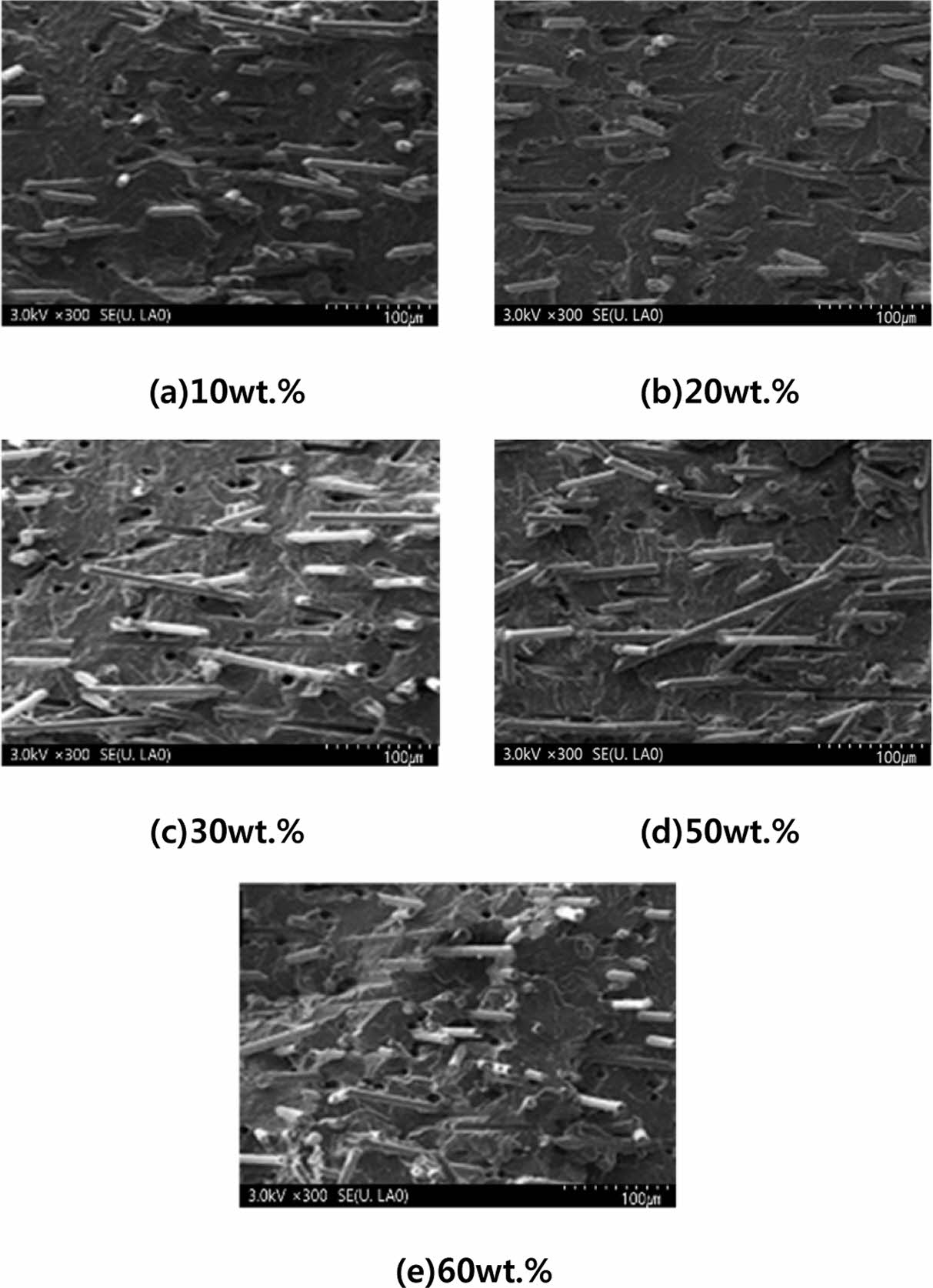 3. Micro-CT 및 FE-SEM을 활용한 강화재 함량에 따른 PA66/GF 열가소성 복합재료 표면의 형태학적 분석 결과, 열가소성 복합재료 시편의 중앙부분에서만 길이 방향으로 일정하게 배향된 것을 확인하였고, 다른 시편에 비하여 상대적으로 낮은 강화재 함량으로 인하여 일부분 미충전 부분이 발생하였음을 확인하였다. 사출 성형 시 건조 부족으로 인한 내부 홀이 모든 시편 단면에서 관찰된 것을 확인하였고, 강화재 함량이 30 wt.% 이상일 때 강화재인 유리섬유가 상대적으로 많이 분포되어 있는 경향을 나타내었다.