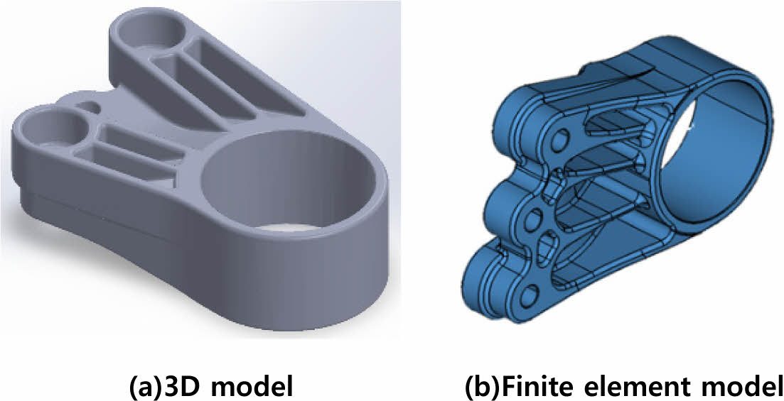 엔진마운트 브라켓은 엔진 서포트(support)라고도 하며, 차량의 수명기간동안 차량 부품들이 차체로부터 이탈되지 않도록 지지해주는 기능을 하기 때문에, 외부 진동에 대한 높은 저항성이 요구된다. 강화재 함량에 따른 열가소성 복합재료 특성 평가 데이터를 기반으로 엔진마운트 브라켓을 형상화한 3D모델 및 시뮬레이션을 위한 유한요소모델을 생성하였다. 3D모델 및 유한요소모델을 생성하기 위하여 비선형 멀티 스케일 모델링(Non-linear multi scale modeling)이 가능한 DIGIMAT(MSC Software Inc., US(State of washington))를 활용하였다. 유한요소 모델 생성 시, 요소 타입은 모두 테트라(tetra) 요소로 구성하였으며, 글로벌 메쉬(global mesh) 사이즈는 150 mm, 로컬 메쉬(local mesh) 사이즈는 0.44 mm로 설정하였다.