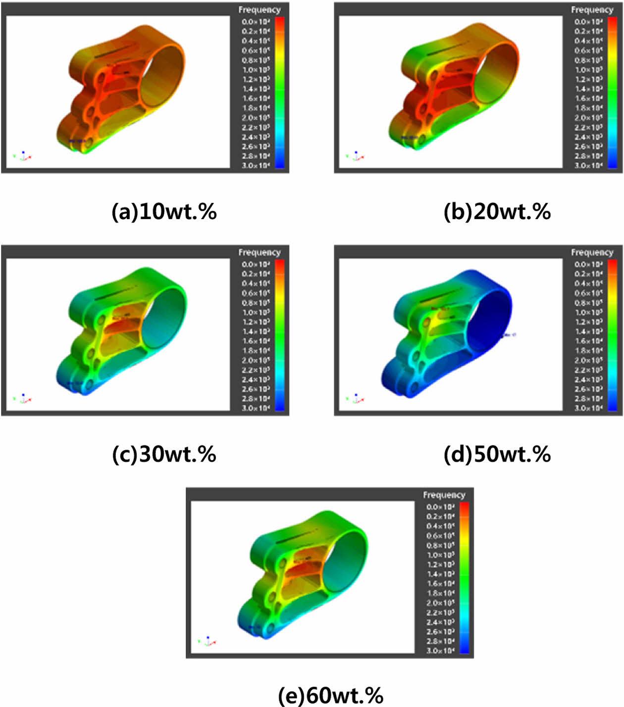 진동 감쇠 성능 시뮬레이션 결과를 Table 3 및 Fig. 9, Fig. 10에 나타내었다. 강화재의 질량분율이 50 wt.%인 경우에 진동 감쇠율 6.7%로 가장 높은 값을 나타내었으나, 강화재의 질량분율이 60 wt.%인 경우에는 6.1%의 값을 나타내었다. 강화재의 질량분율이 10 wt.%인 경우에는 진동 감쇠율이 5%을 넘지 못하고, 4.4%의 값을 나타내었다. 강화재의 질량분율이 높아질수록 진동감쇠 성능이 비례하여 증가하는 경향을 나타내지만, 어느 수준 이상에서는 더 이상 증가하지않고, 소폭 감소하는 결과를 나타내었다. 실제 실험값과 시뮬레이션 값과의 비교 결과, ±5% 이내의 근사치를 나타내었으며, 강화재의 질량분율이 60 wt.%일 때 결과값의 차이가 가장 크게 발생하였다. 이는 실제 사출성형 공정 상에서 발생한 버(burr)나 일부 흑조현상으로 인하여 오차가 발생한 것으로 판단된다. 열가소성복합재료 제조 시, 열가소성 복합재료로로 다른 수지가 활용되었을 경우나, 유리섬유의 배향각도나 분포 정도를 데이터화하여 시뮬레이션을 진행할 경우, 이에 따른 파급효과가 더욱 우수할 것으로 사료된다.